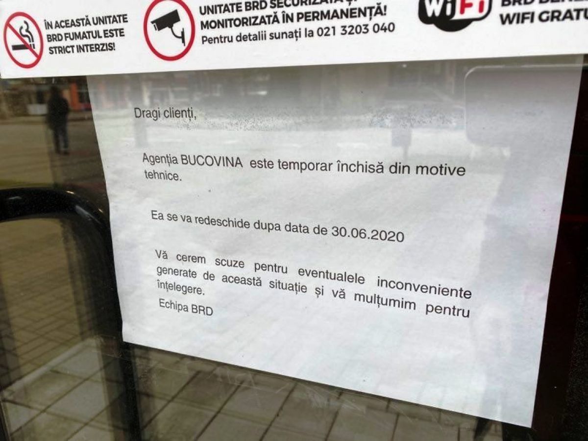 Pe 18 mai, la agenția BRD din cartierul Bucovina era lipit un afiș cu un motiv de sistare a activității pe care nu îl întâlnești chiar în orice zi și în care nu era prezentată o dată fermă pentru redeschidere.
