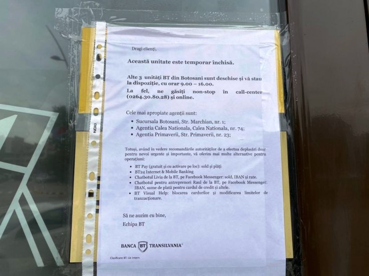 ”Această unitate este temporar închisă. Alte trei unități BT din Botoșani sunt deschis și vă stau la dispoziție cu orar 9:00 – 16:00”,