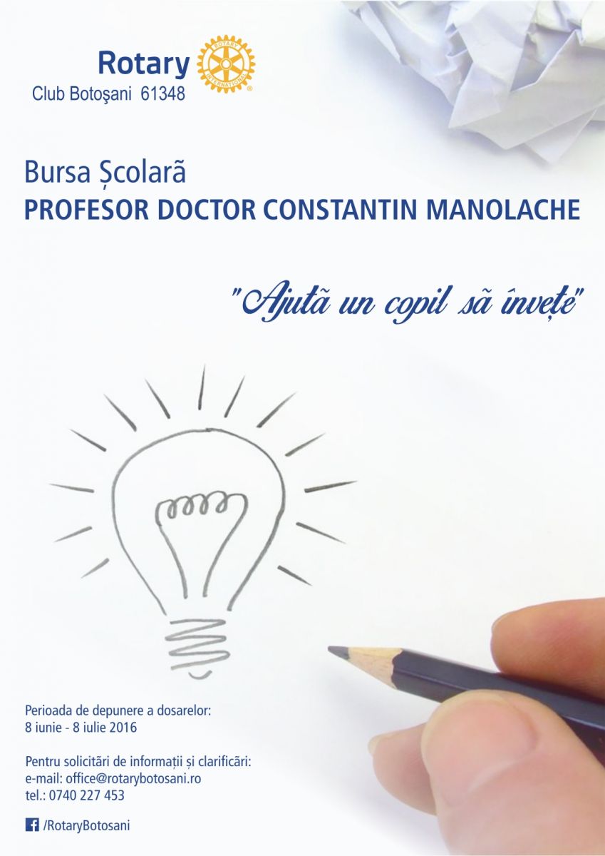 Pentru sprijinirea elevilor cu performante, Clubul Rotary Botoșani continuă proiectul “Ajuta un copil să învețe” acordând și pentru anul scolar 2016-2017 un număr de două burse scolare “Profesor doctor Constantin Manolache“.