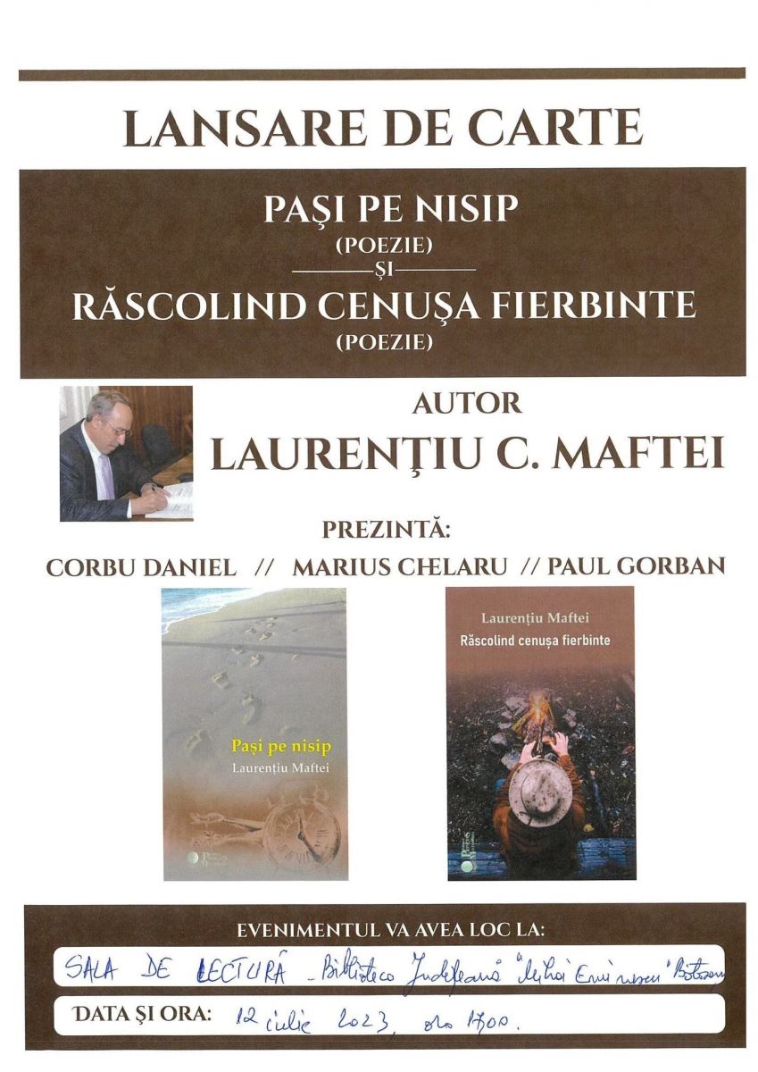 Într-un comunicat transmis de reprezentanții Bibliotecii Județene se menționează că miercuri, 12 Iulie 2023, începând cu ora 17:00, în Sala de lectură a Bibliotecii Județene ,,Mihai Eminescu” Botoșani va avea loc o dublă lansare de carte, semnate de scriitorul Laurențiu C. Maftei, care după ce a publicat câteva volume de istorie în anii precedenți, iată că din anul 2020, după câștigarea unui important premiu II la un Concurs Internațional de Poezie și Epigramă, publică poezii, unele create cu mulți ani în urmă, care după aprecierea unor importanți critici, autorul se remarcă tot mai mult și în acest domeniu literar al poeziei.