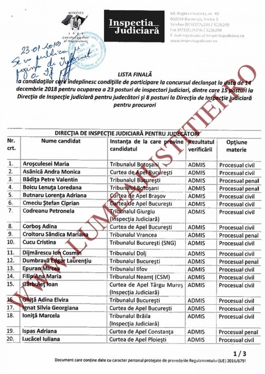 Vezi mai jos lista cu judecatorii si procurorii care candideaza pentru un loc la Inspectia Judiciara