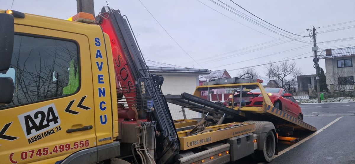 Mașina a fost scoasă din șanț și preluată pe platformă de SOS Savencu.