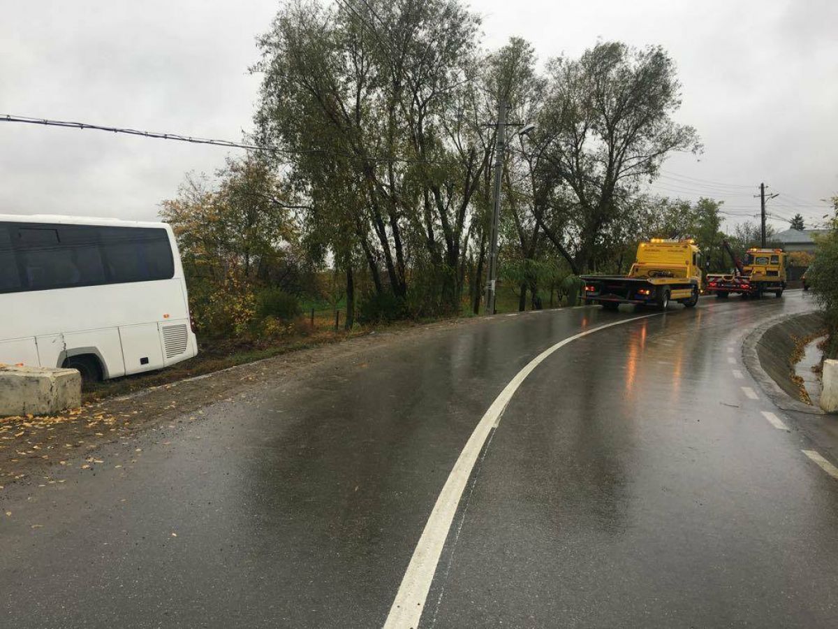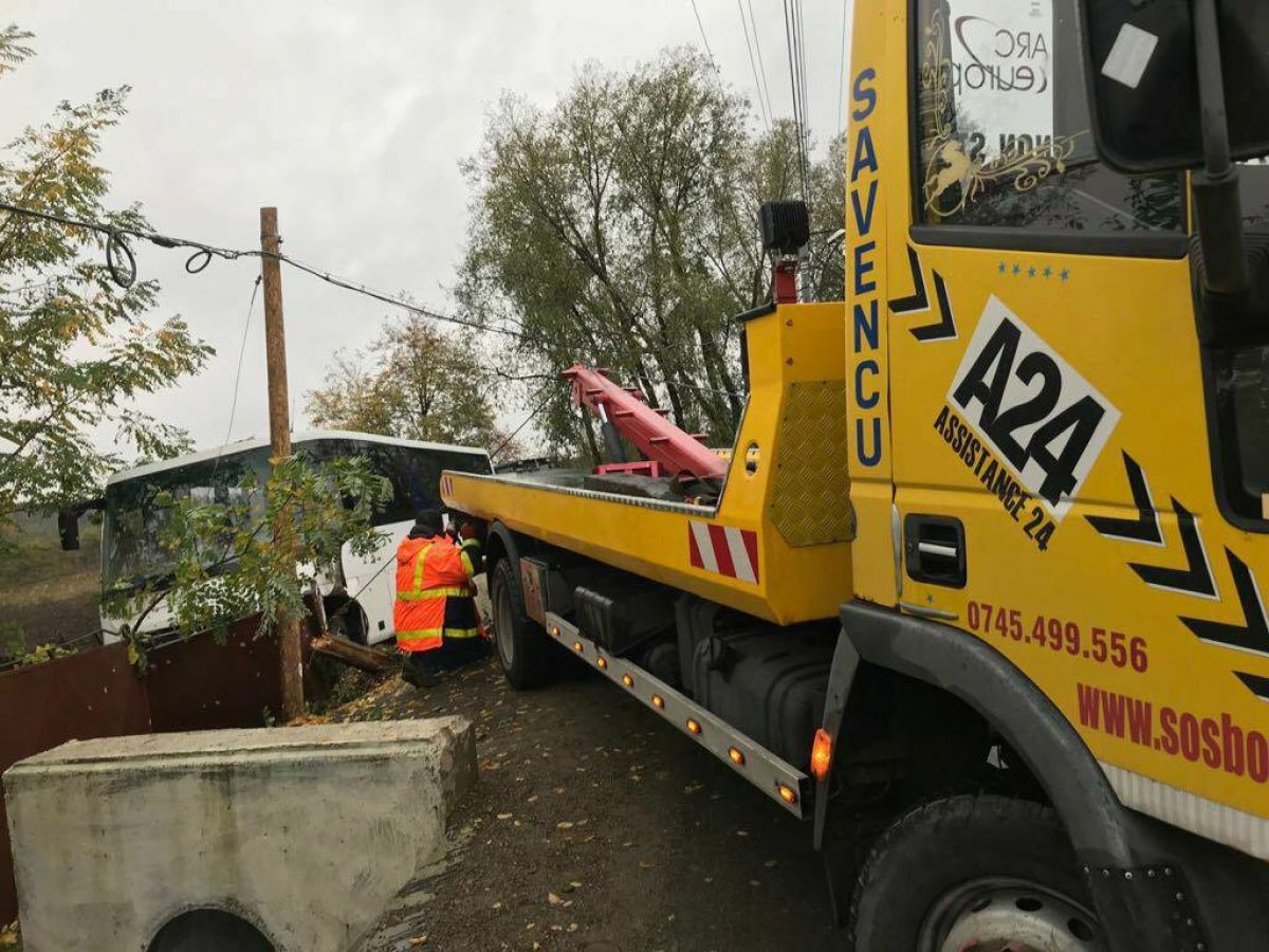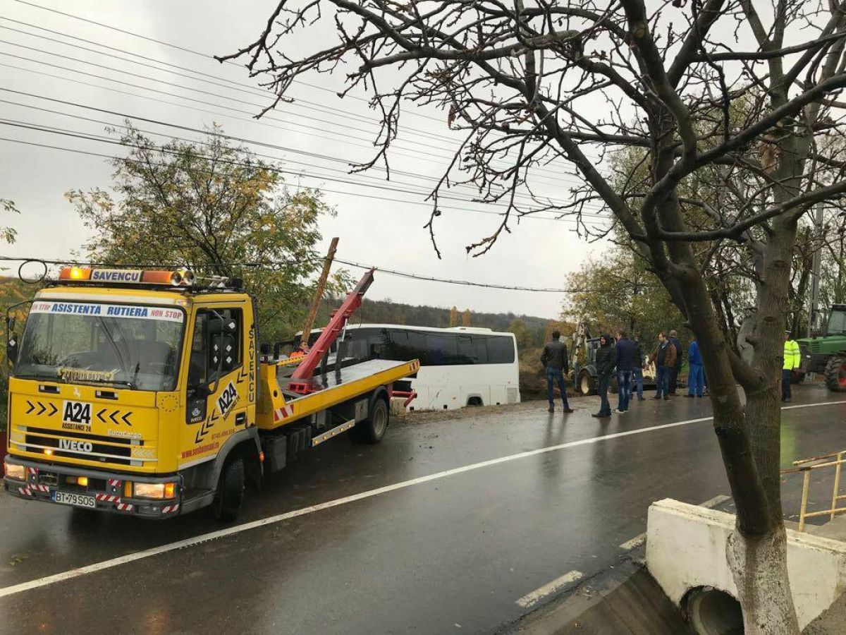 Echipajul trimis la faţa locului pentru readucerea autocarului pe carosabil a muncit două ore până ce a reuşit să-l tracteze.