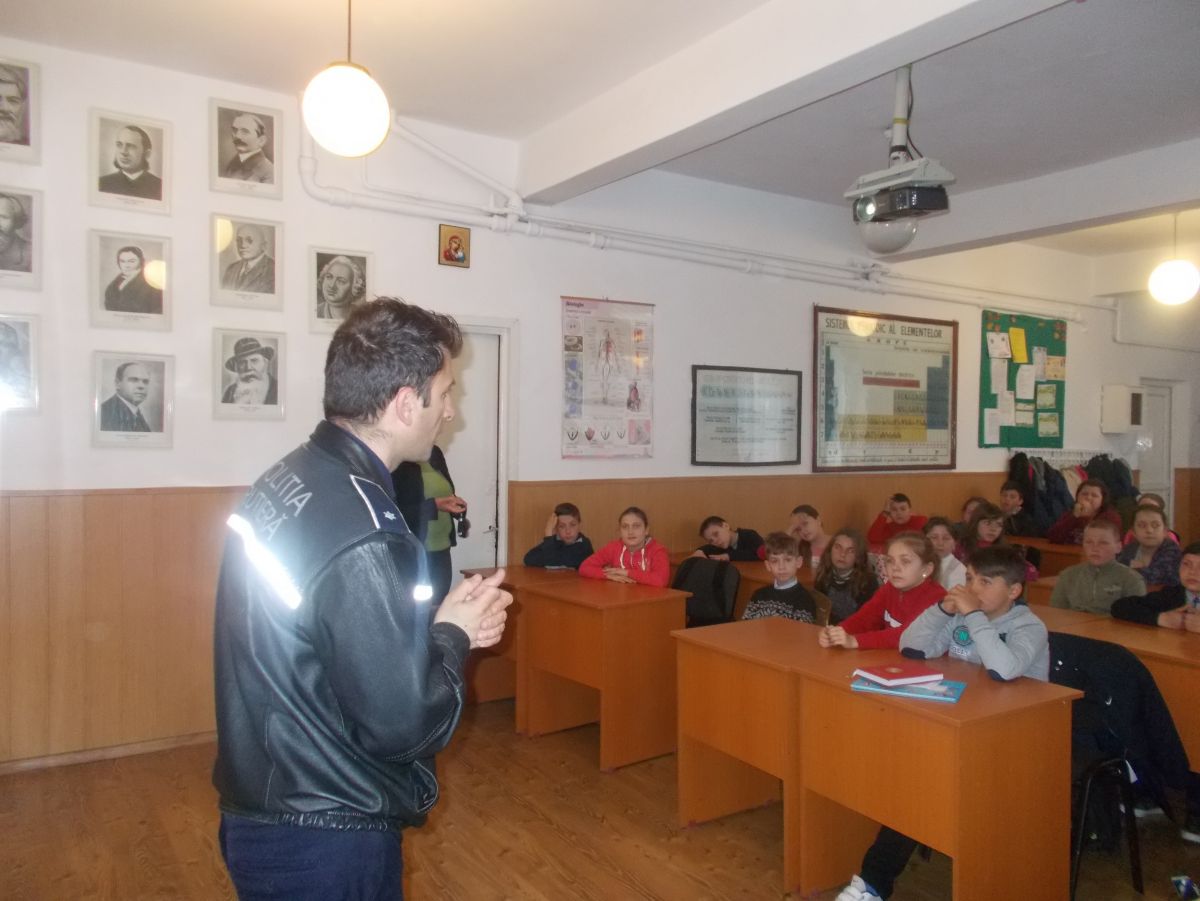 Copiilor le-au fost prezentate materiale video cu recomandări şi teme de educaţie rutieră, discuţiile având caracter interactiv. Poliţiştii au promis că se vor întoarce mereu în sălile de clasă pentru a discuta cu copiii, având convingerea că o întâlnire de acest tip previne o întâlnire mai puţin plăcută la sediul secţiei de poliţie.