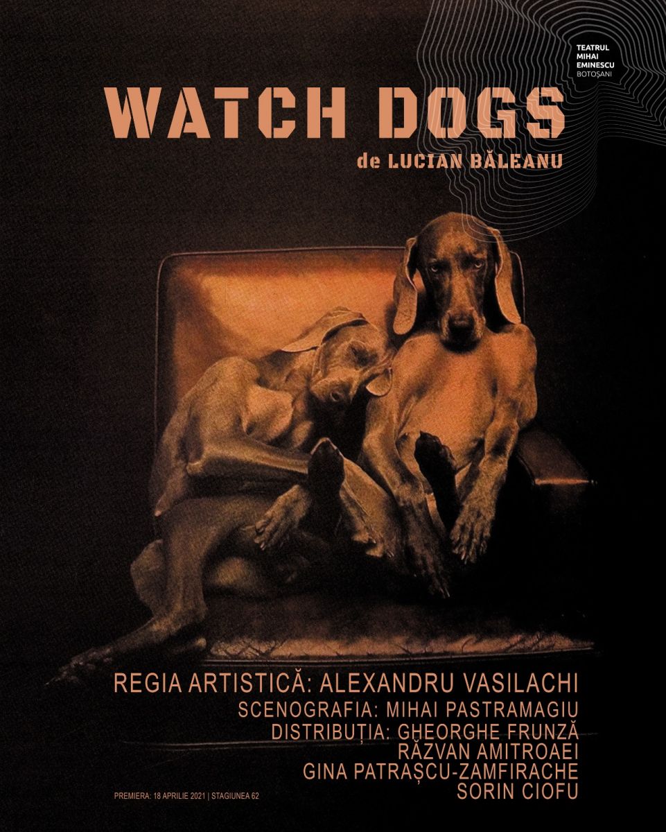 Duminică, 9 aprilie, de la ora 18.00, botoșănenii sunt invitați la spectacolul „Watch Dogs”, de Lucian Băleanu, în regia lui Alexandru Vasilachi, scenografia Mihai Pastramagiu. Din distribuție fac parte actorii: Gheorghe Frunză, Răzvan Amitroaei, Sorin Ciofu și Gina Pătrașcu-Zamfirache.