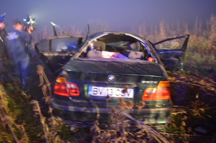 Imagini cutremurătoare au putut fi văzute în urmă cu câteva minute la ieşirea din Copălău spre Botoşani, acolo unde un BMW cu patru persoane a ajuns pe câmp, la câţiva metri de şosea.