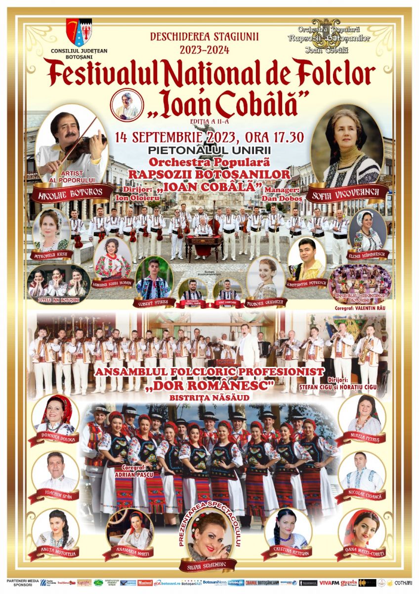 Orchestra Populară ,,Rapsozii Botoșanilor”, Ioan Cobâlă, instituție aflată în subordinea Consiliului Județean Botoșani, organizează în zilele de 14 și 15 septembrie a doua ediție a Festivalului Național de Folclor „Ioan Cobâlă”.
