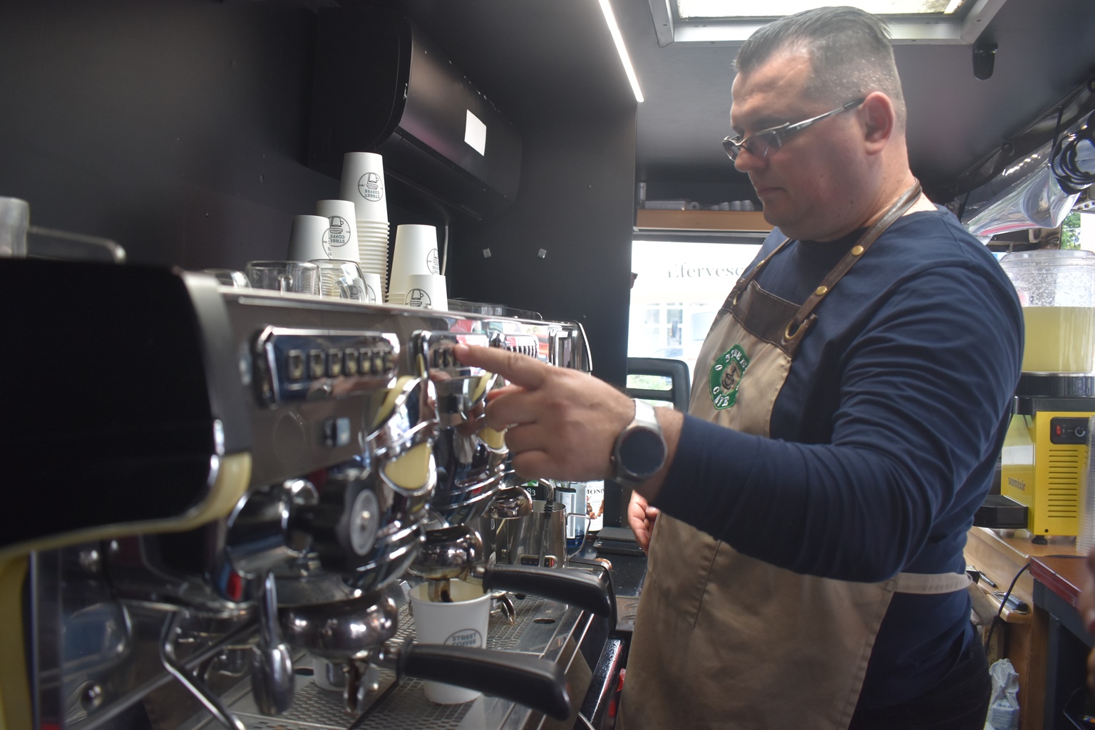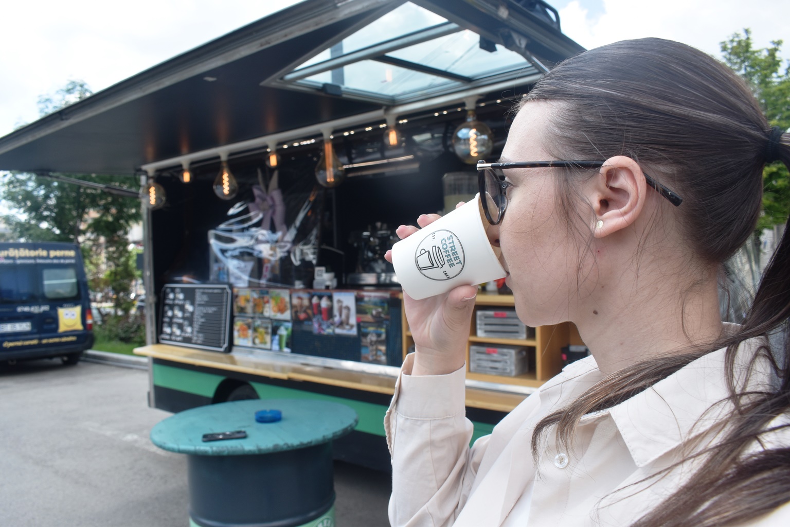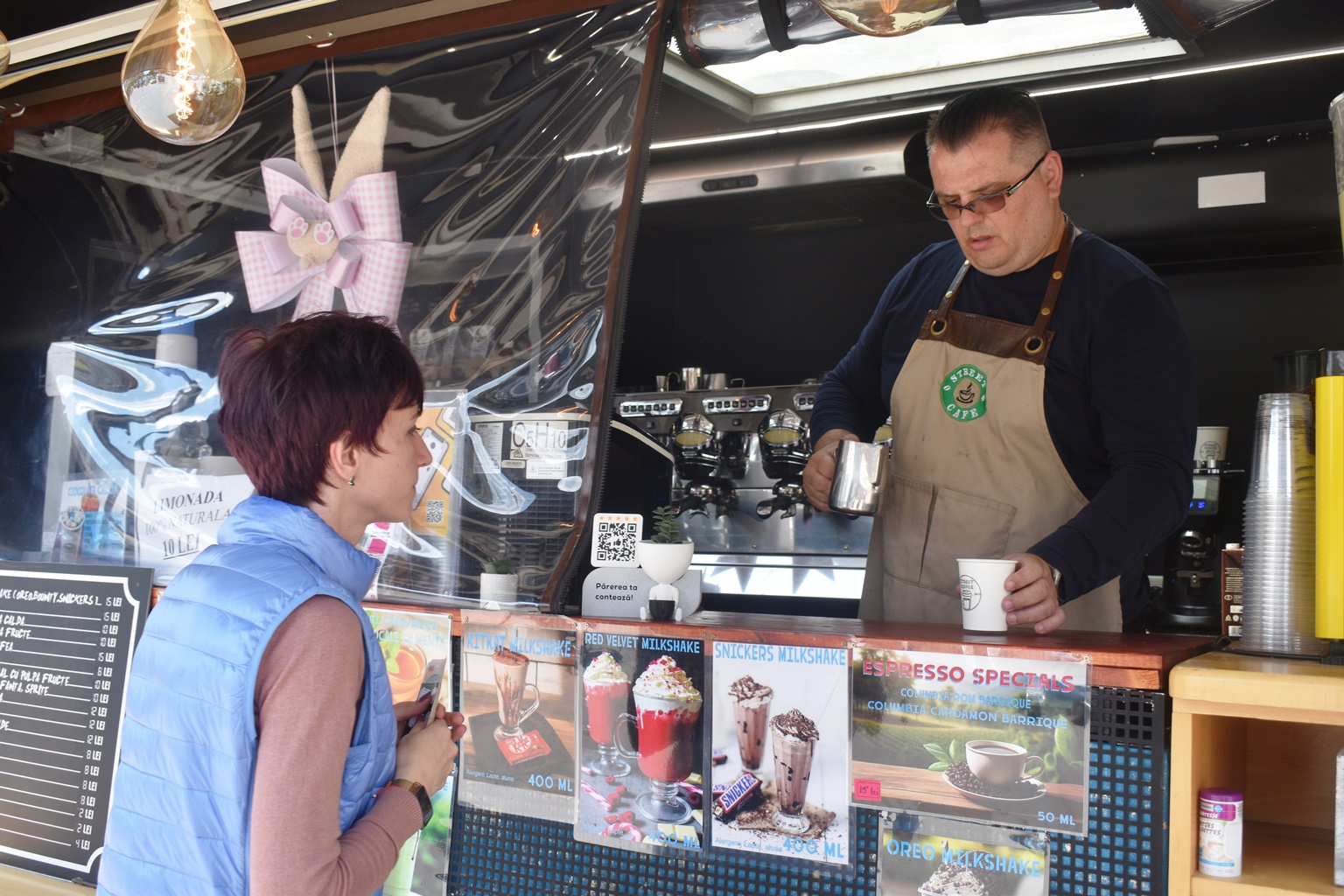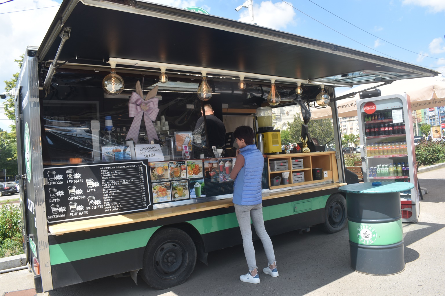 După care ajunge la cafeneaua noastră amenajată în camioneta din parcarea fostului magazin ”Botoșani”, unde poți savura ce își dorește inima: Ristretto, Espresso, Doppio, Americano, Macchiato, Cappuccino, Flat White, Latte.