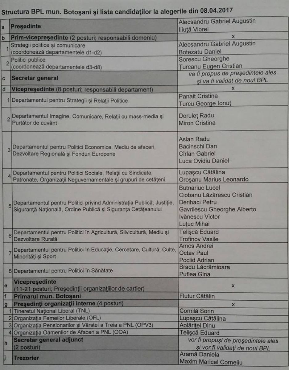 Dimineaţă la ora 9:00 a expirat perioada de înscriere pentru funcţiile de conducere. Probabil cea mai importantă noutate o reprezintă intrarea în cursa pentru preşedinţie a consilierului Gabriel Alecsandru, care îl concurează astfel pe Viorel Iliuţă. Candidatura sa, dar şi a unei sumedenii de membri ai Tineretului Naţional Liberal pare să facă parte dintr-o strategie a junilor din partid de a prelua conducerea din mâinile seniorilor.