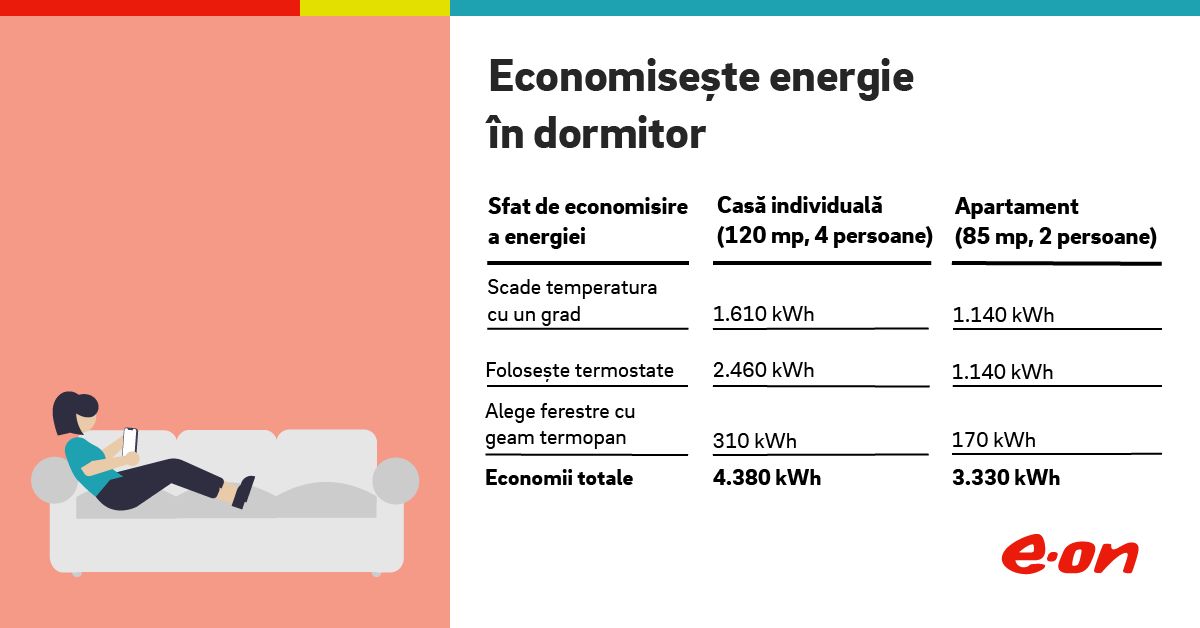 Cu fiecare grad mai puțin setat la termostat se reduce consumul de gaze naturale cu aproximativ 6%. Dacă optăm pentru ferestre cu geam termopan, folosim termostatul și scădem temperatura din dormitor cu doar 1°C, putem reduce consumul anual cu 3.330 kWh – în cazul unui apartament de 85mp sau chiar cu 4.380 kWh – pentru o casă individuală de 120mp. Acest lucru înseamnă o economie la bugetul familiei de 1.032,3 lei, respectiv de 1.357,8 lei**.