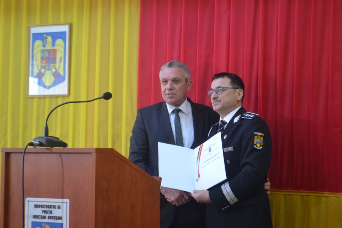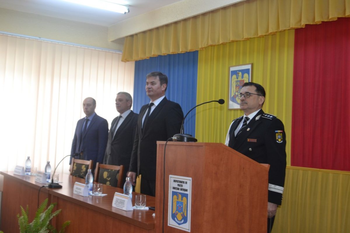 Mai întâi, inspectorul șef IPJ Botoşani, comisar şef Viorel Șerbănoiu, a dat citire mesajului ministrului Afacerului Interne, Carmen Dan, adresat politiștilor români.