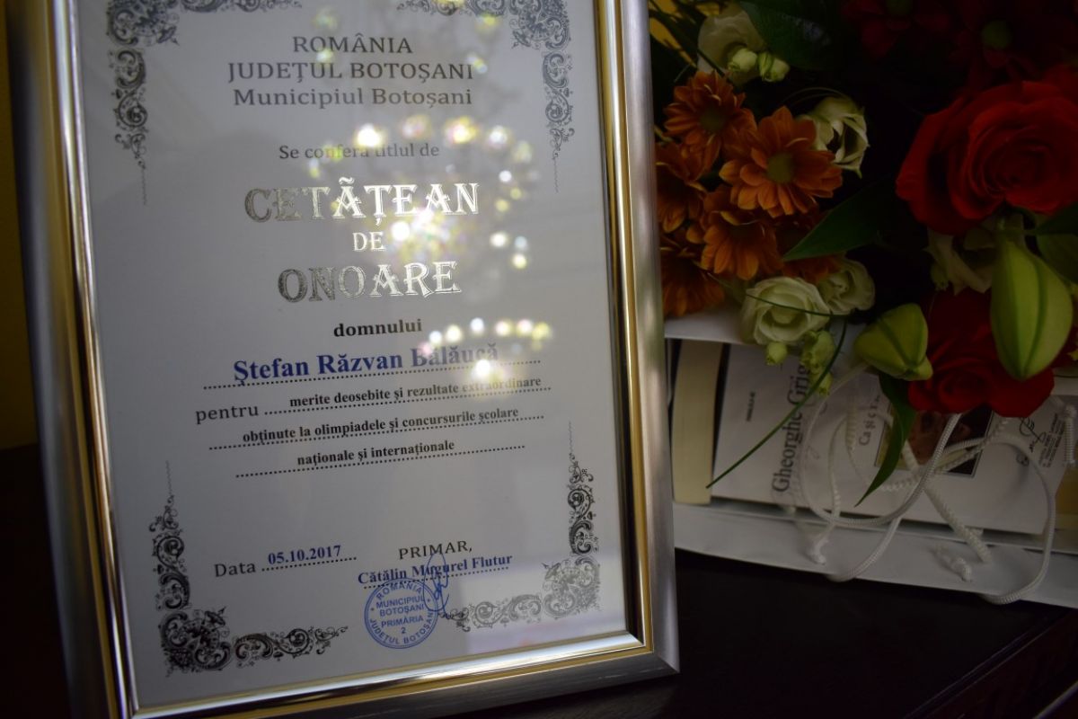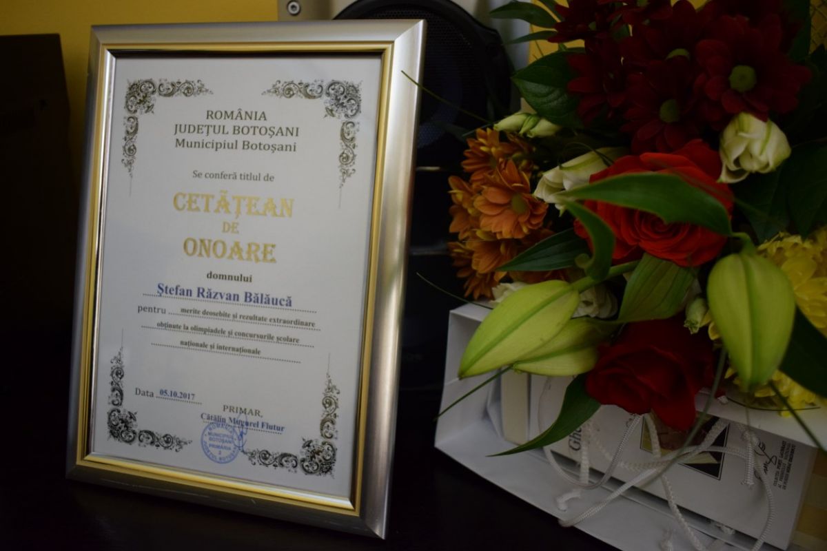 Elevul Ștefan Răzvan Bălăucă, olimpic la concursuri naționale și internaționale este oficial cetățean de onoare al municipiului Botoșani.