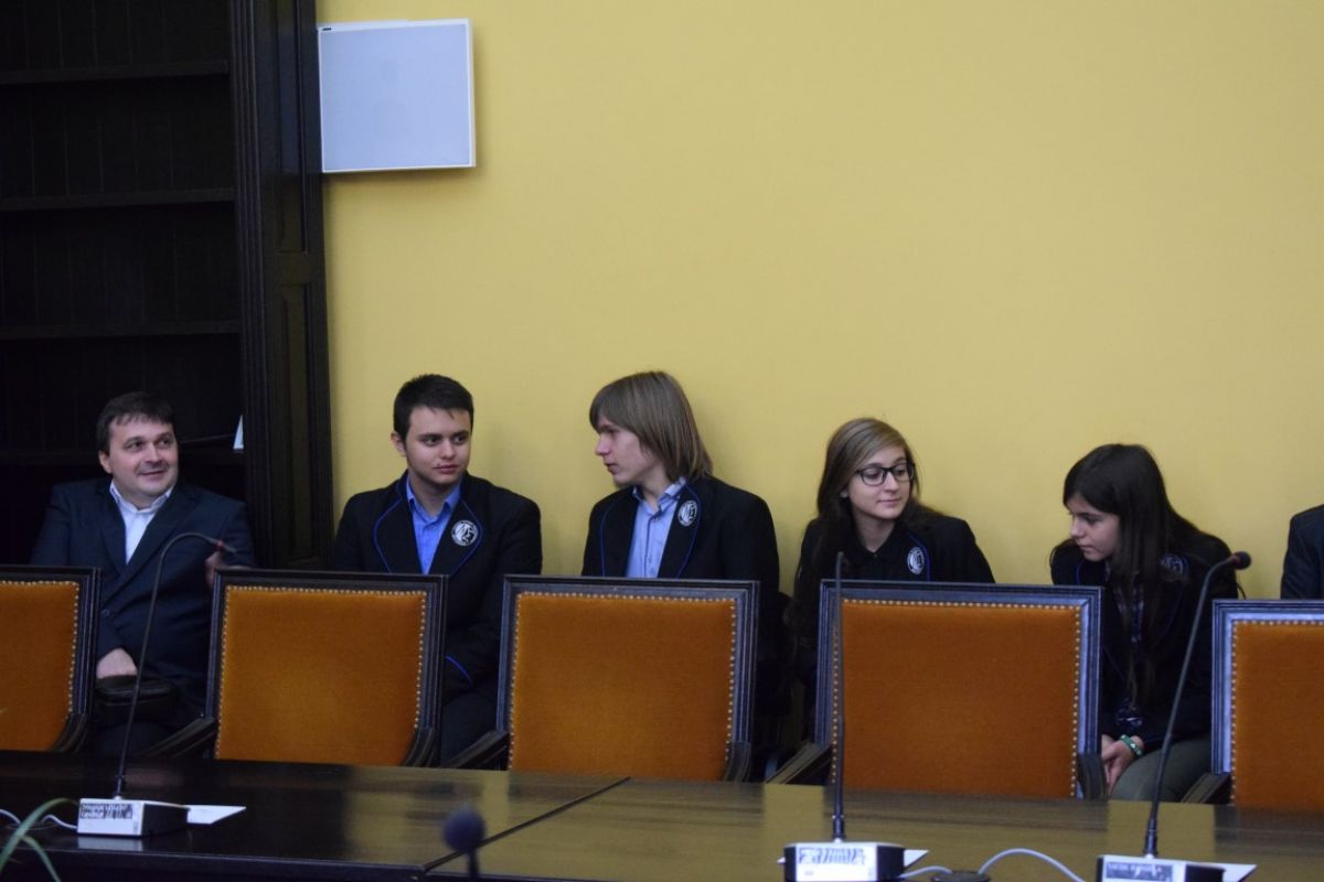 Cei doi se află în sala de ședințe a Consiliului Local unde urmează să fie premiați în mod oficial de primarul Cătălin Flutur și aleșii municipali.