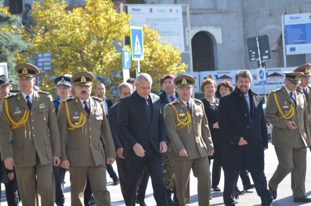 Cu toții s-au îndreptat spre locul de manifestație unde militarii își luaseră deja poziția de drept. Prefectul județului a dat onorul militar după care, comandantul Garnizoanei de la Botoșani a dat citire mesajului transmis de ministrul apărării naționale, Mircea Dușa. A urmat oficierea slujbei religioase și mesajele transmise de Costică Macaleți și Gheorghe Sorescu, președintele Consiliului Județean Botoșani. Primăria nu a fost reprezentată de nimeni, ba mai mult, la depunerea coroanelor, singurii trei consilieri care au fost prezenți au făcut notă discordantă cu prezența mai numeroasă a celorlalte instituții, fiind depășită numeric chiar și de Inspectoratul Școlar.