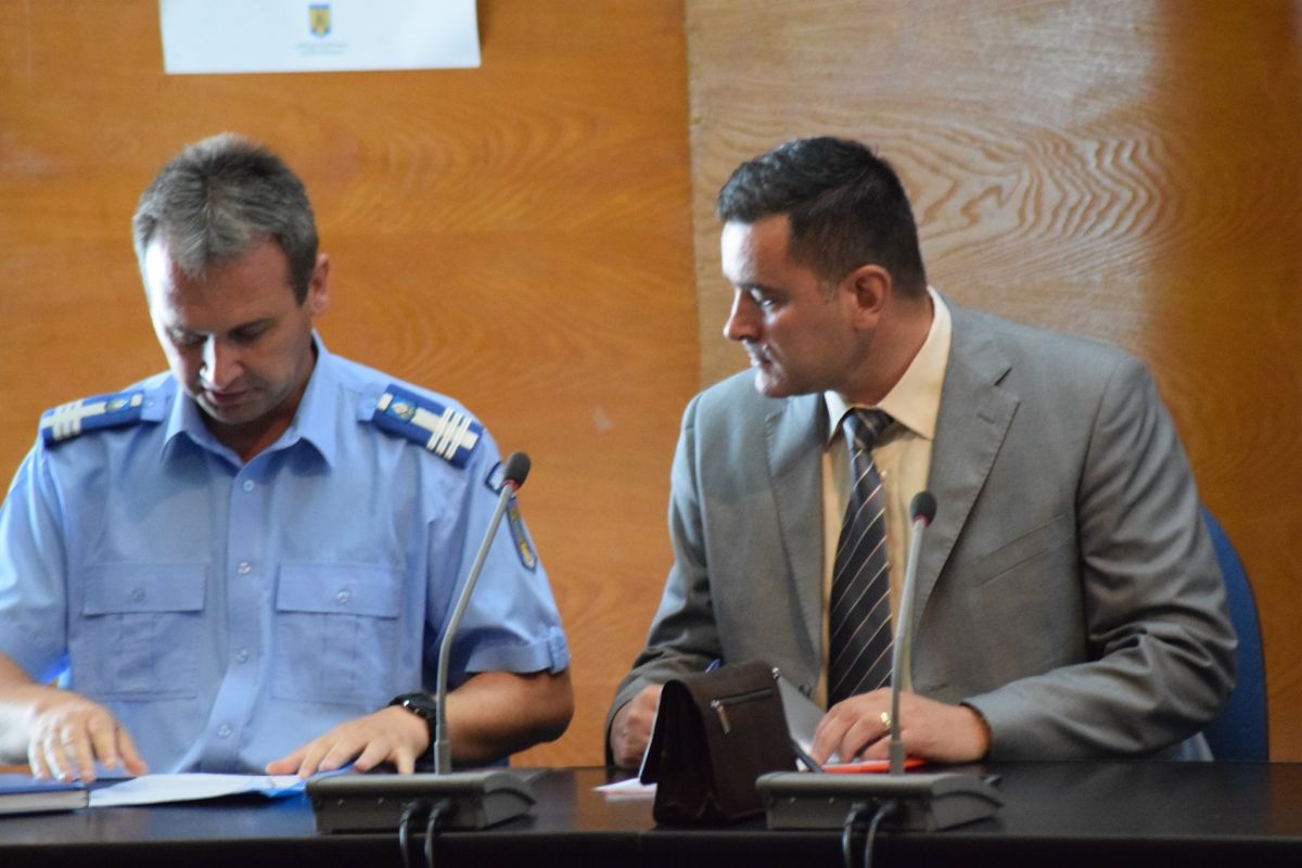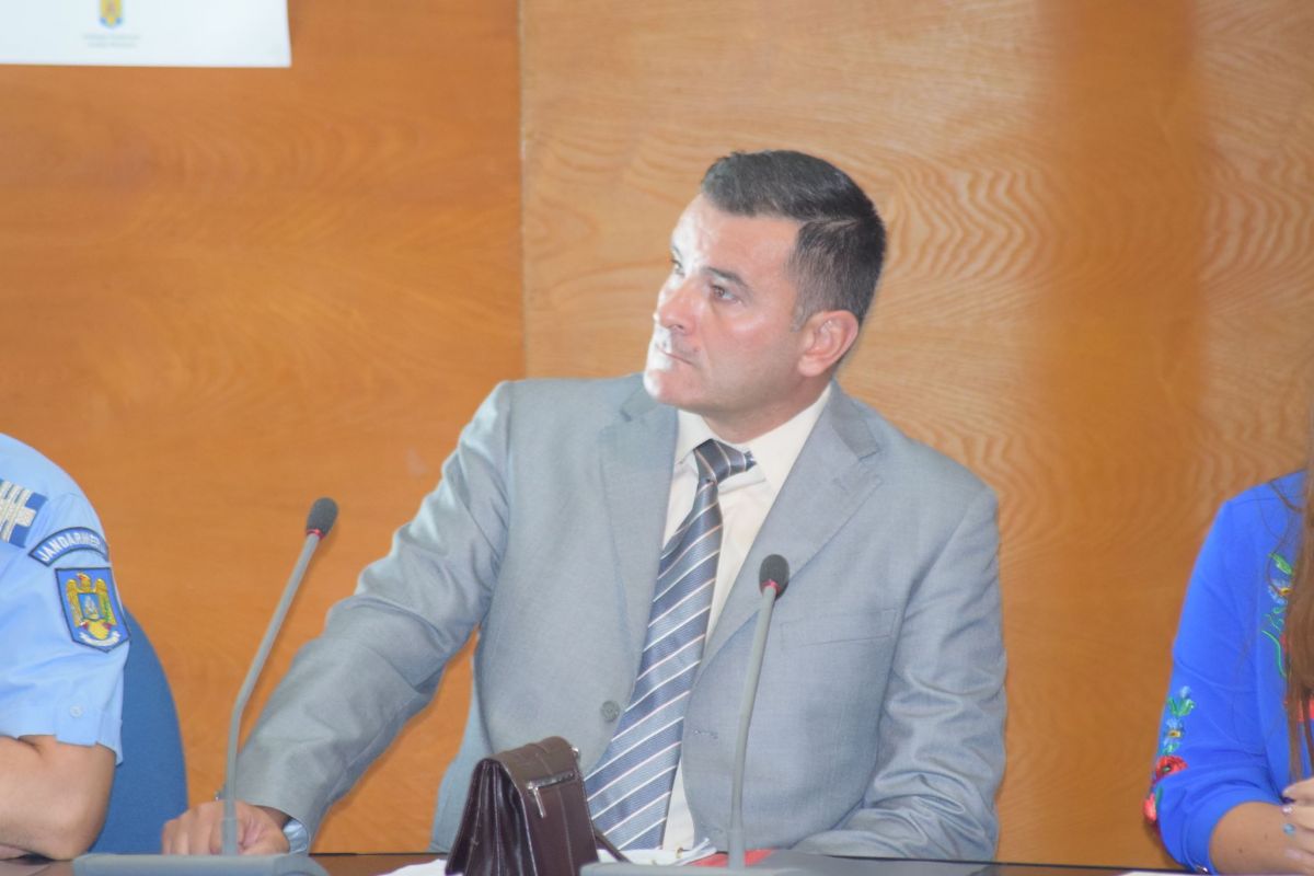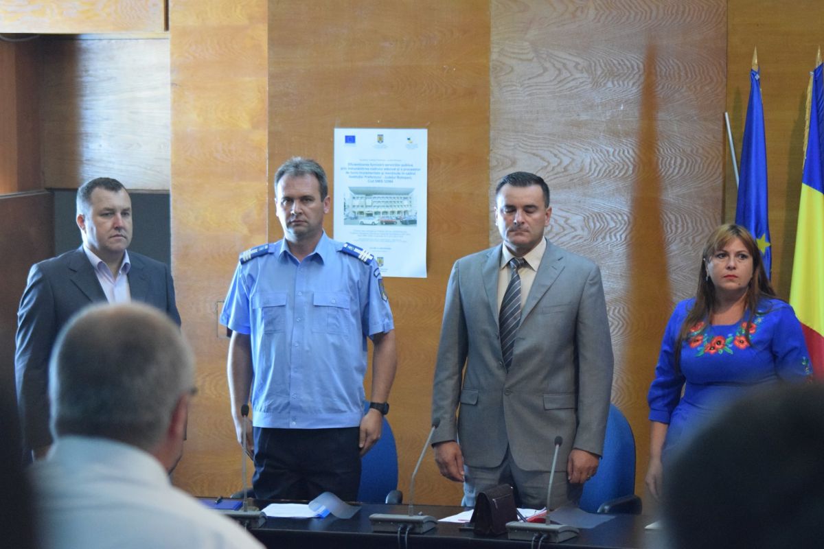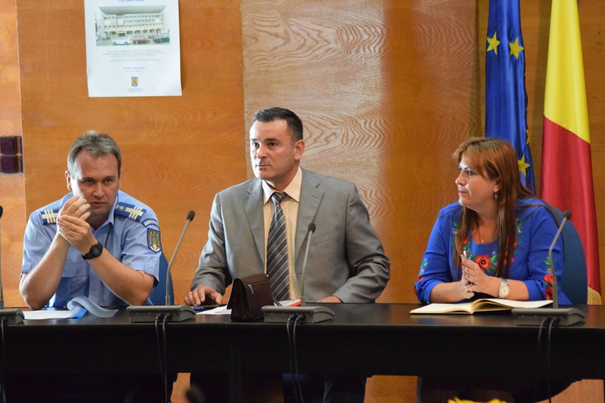 Șeful Poliției a venit la ședință îmbrăcat în costum și nu cu uniformă de polițist. El a fost prezentat de prefectul Dan Nechifor și apoi a luat cuvântul pentru a prezenta primul punct aflat pe ordinea de zi a ședinței.