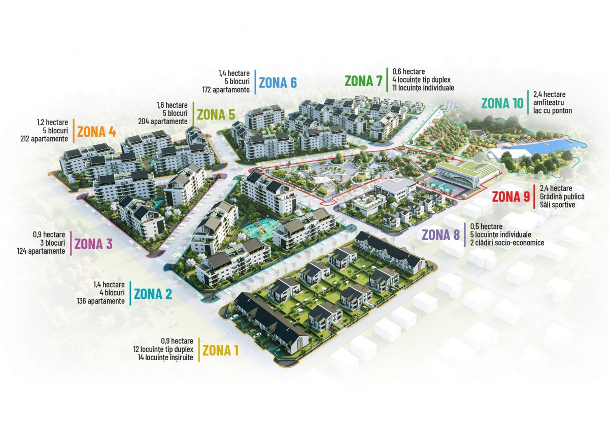 Întreaga dezvoltare rezidențială va cuprinde 22 clădiri de locuințe colective (~850 de apartamente) P+3 și P+4, 16 locuințe individuale, 14 locuințe înșiruite P+1, 16 locuințe tip duplex P+1 și P+2, spații comune pentru servicii comerciale si alimentatie publica, medicale, sportive (sala fitness, teren de baschet și bazin de înot acoperit) și de învățământ, spații verzi, parcuri interioare, alei și parcaje, spații de agrement și relaxare, integrate într-un concept unitar de arhitectură.