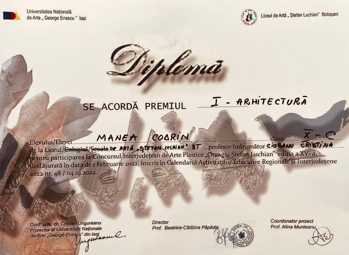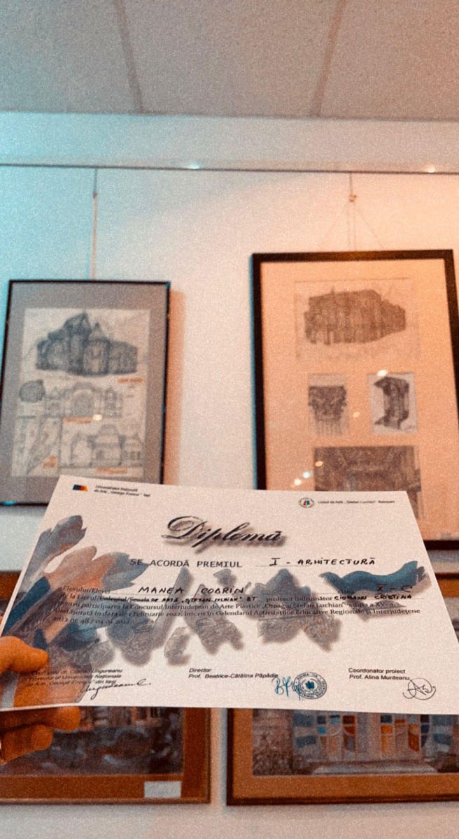 Premiul 1 la categoria ”Arhitectură” i-a revenit lui Codrin Manea, elev în clasa a X – a.