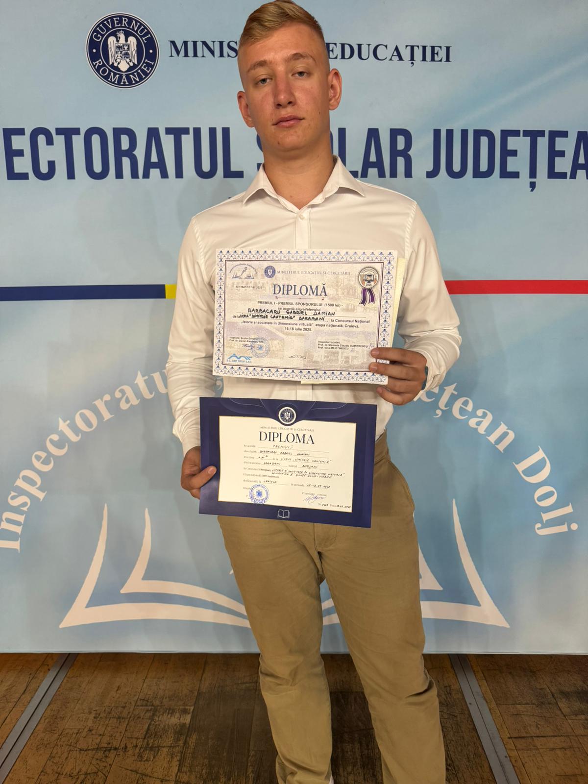 Cu o prestație de excepție în fața comisiei de concurs, elevul BARBACARIU GABRIEL DAMIAN, pregătit de dl profesor Sîrbu Lucian, a reușit să obțină punctajul maxim, respectiv 100 de puncte, punctaj ce i-a asigurat primul loc în clasamentul final.