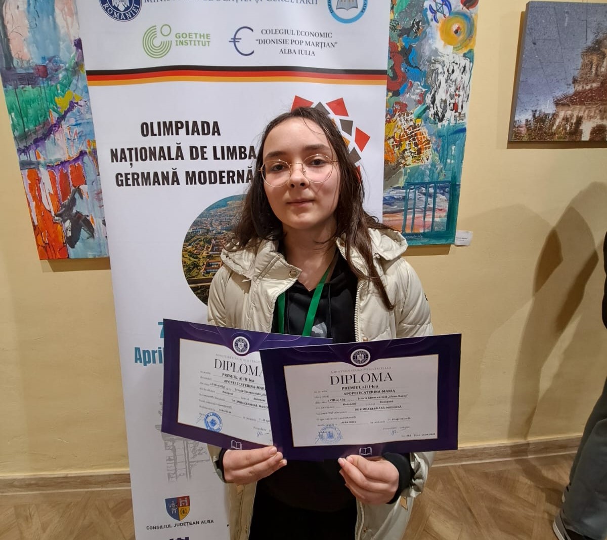Premiată la etapa națională a Olimpiadei de Limba germană modernă a fost eleva Apopei Ecaterina-Maria, care a obținut Premiul al II-lea la proba scrisă și Premiul al III-lea la proba de proiect.
