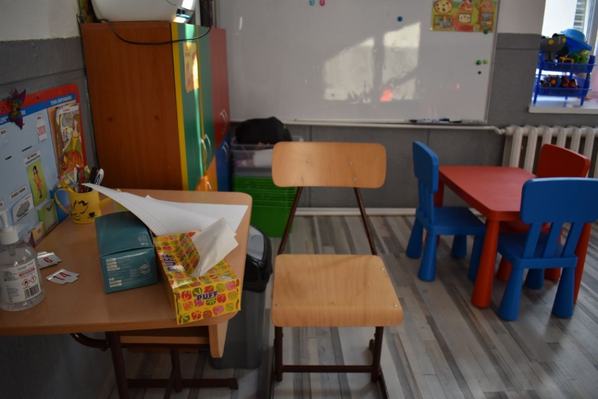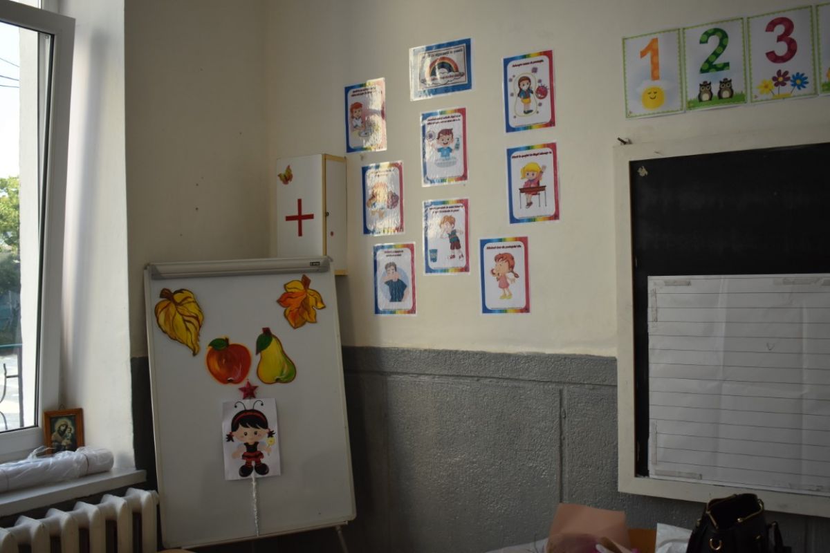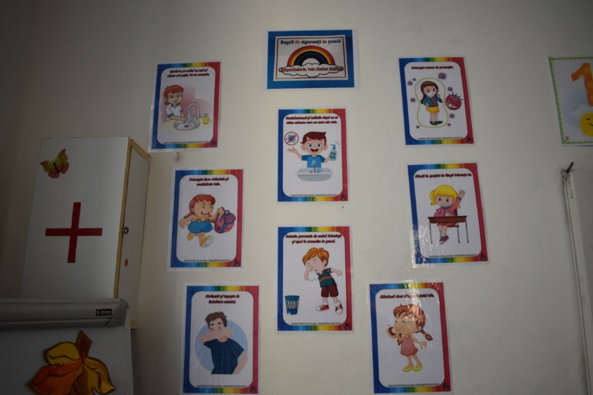 Cele care așteptau grupele de la clasele pregătitoare au așezat frumos pe băncuțe ecusoane cu numele grupei, „albinuțe” sau „buburuze istețe”. Măsurile de protecție împotriva COVID au fost desenate pe coli albe și așezate pe pereți pentru a fi asimilate mai ușor de copii.