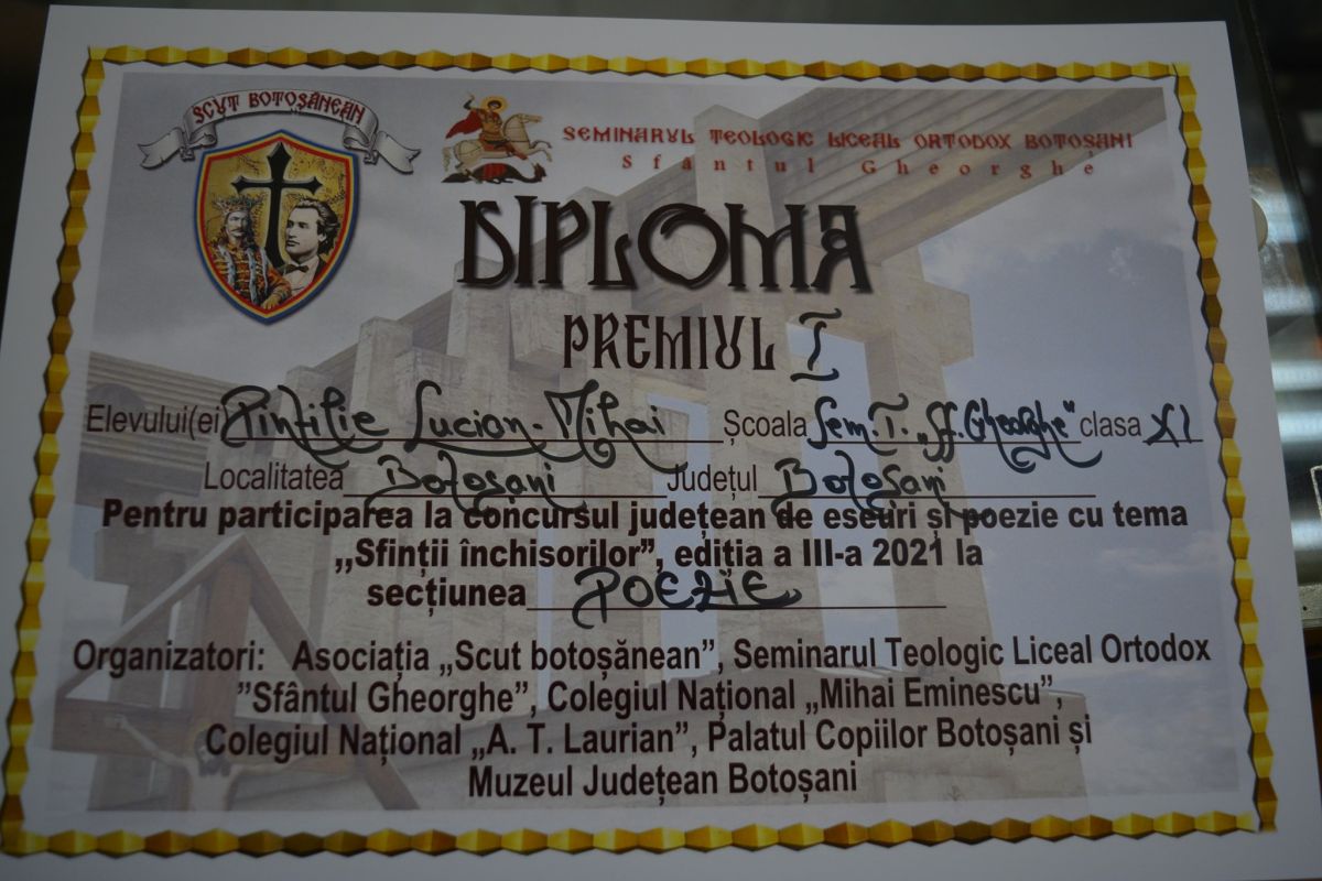 A obținut Premiul I la secțiunea Eseu a concursului ”Sfinții închisorilor”. Este la prima participare și recunoaște că este pasionat de istorie, dar că a fost atras și de tema propusă.