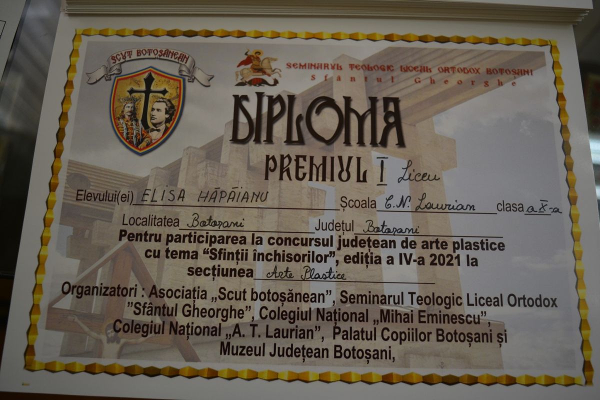 Joi, 10 iunie 2021, de la ora 14.00, la Muzeul Județean Botoșani s-a derulat festivitatea de premiere a concursului ”Sfinții închisorilor”, zeci de elevi, dar și profesori, fiind prezenți atât la vernisarea expoziției, cât și la anunțarea câștigătorilor. Tinerii din Corul ”Sfântul Ioan Iacob Hozevitul” au impresionat audiența, oferind cântece pline de simbol creștin.