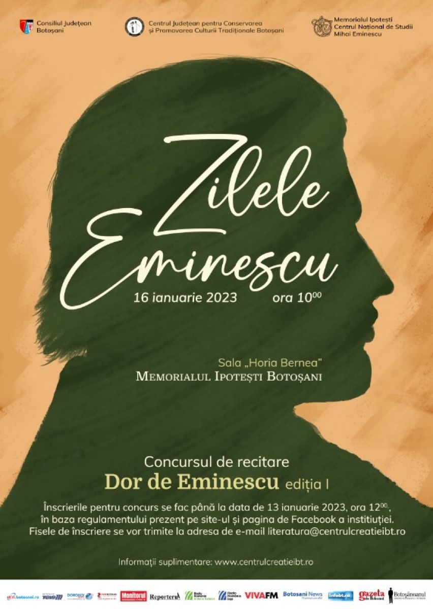 Centrul Județean pentru Conservarea și Promovarea Culturii Tradiționale Botoșani, cu sprijinul Consiliului Județean Botoșani, și în colaborare cu Memorialul Ipotești – Centrul Național de Studii Mihai Eminescu, organizează în data de 16 ianuarie 2023, ora 10:00, în Sala „Horia Bernea” de la Memorialul Ipotești, prima ediție a Concursului de recitare „Dor de Eminescu”, în cadrul Zilelor Eminescu 2023.