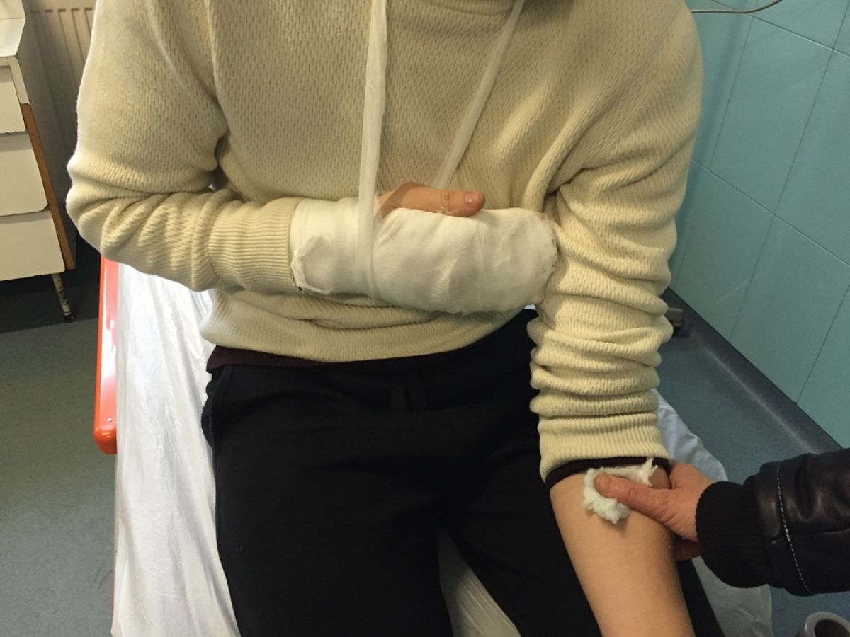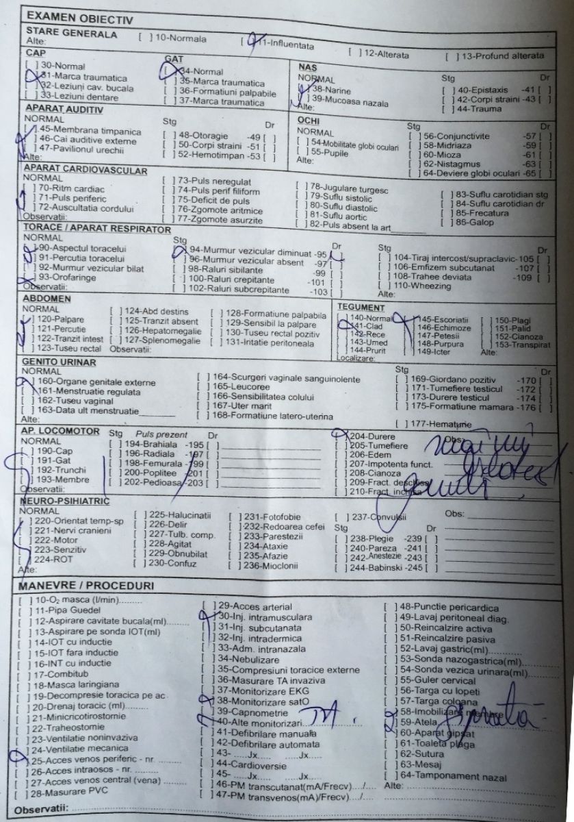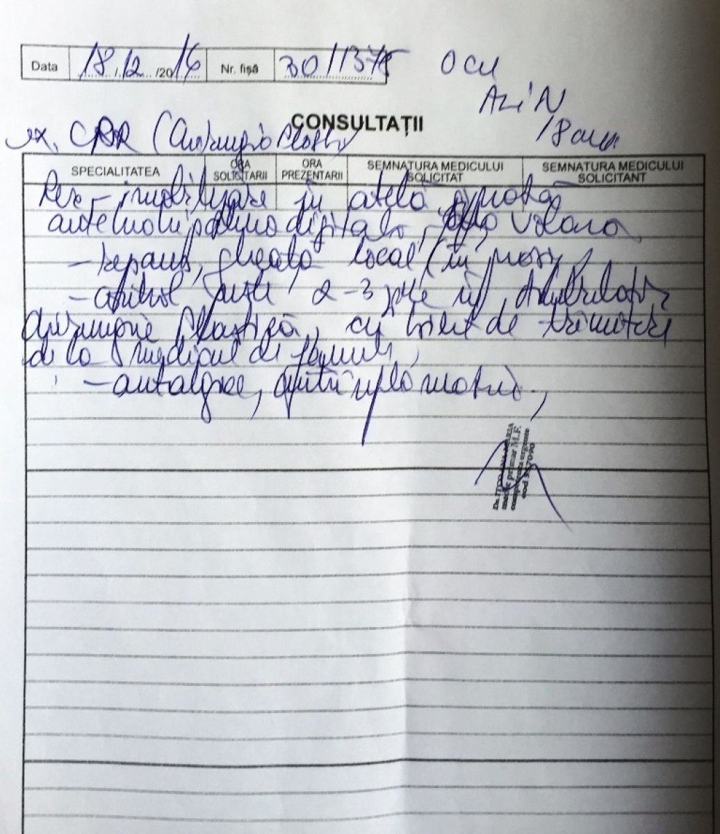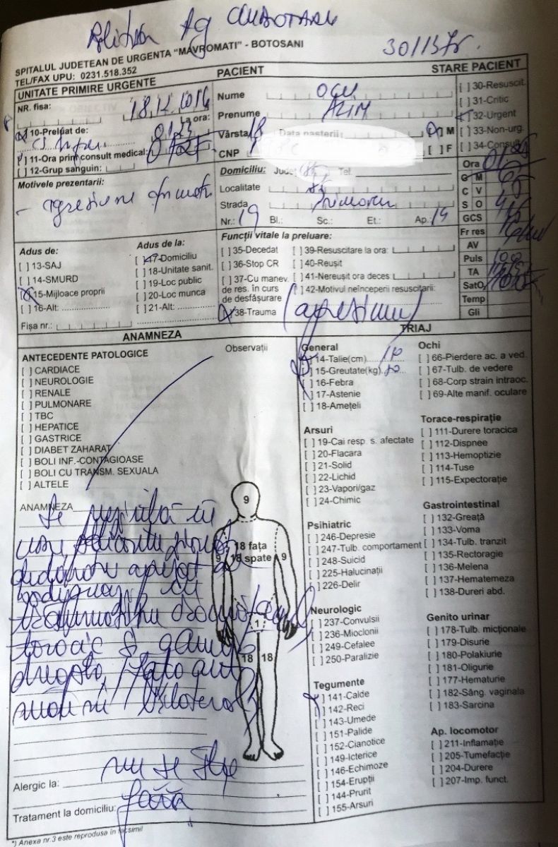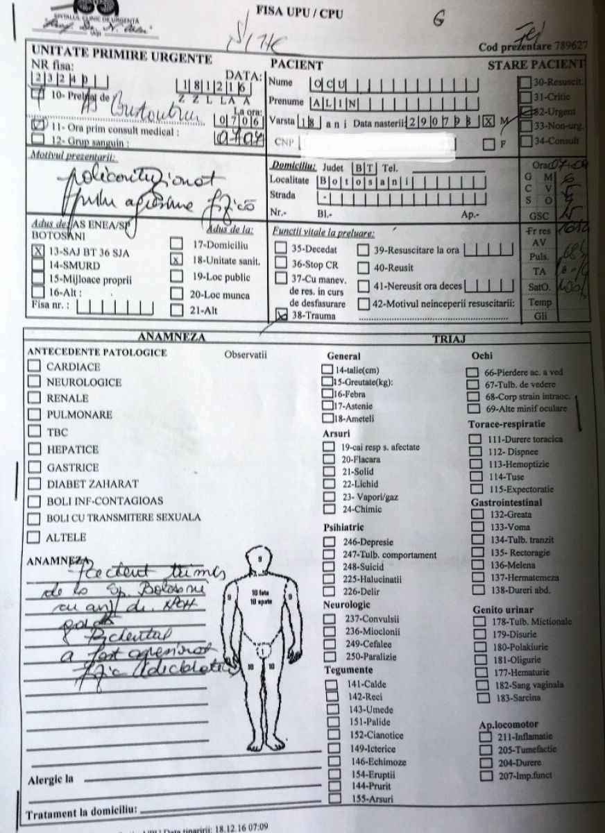 Tânărul care în vară a împlinit 18 ani a stat în noaptea de sâmbătă spre duminică până în jurul orei 2:00 la Poliție, după care a ajuns la Spitalul Județean. După cum se poate vedea și din fișa medicală de mai jos, aici a fost diagnosticat cu traumatism cranio-facial, toracic și la gamba dreaptă, răni despre care se precizează că au fost dobândite prin ”agresiune”. De asemenea, antebrațul drept i-a fost imobilizat într-o atelă ghipsată, având două degete rupte. Întrucât computerul tomograf de la ”Mavromati” nu funcționează, a fost transportat cu o ambulanță la o unitate medicală din Iași. La Spitalul Clinic de Urgență ”Prof. Dr.Nicolae Oblu” s-a menționat în fișă, printre altele, că pacientul este ”policontuzionat prin agresiune fizică”. Ziua de luni l-a găsit tot prin spitale pentru investigații suplimentare deoarece acuză dureri de cap. Nu doar el a avut de suferit, ci și telefonul său, pe care l-ar fi avut în mână atunci când a fost luat la bătaie, l-a scăpat și s-a crăpat.