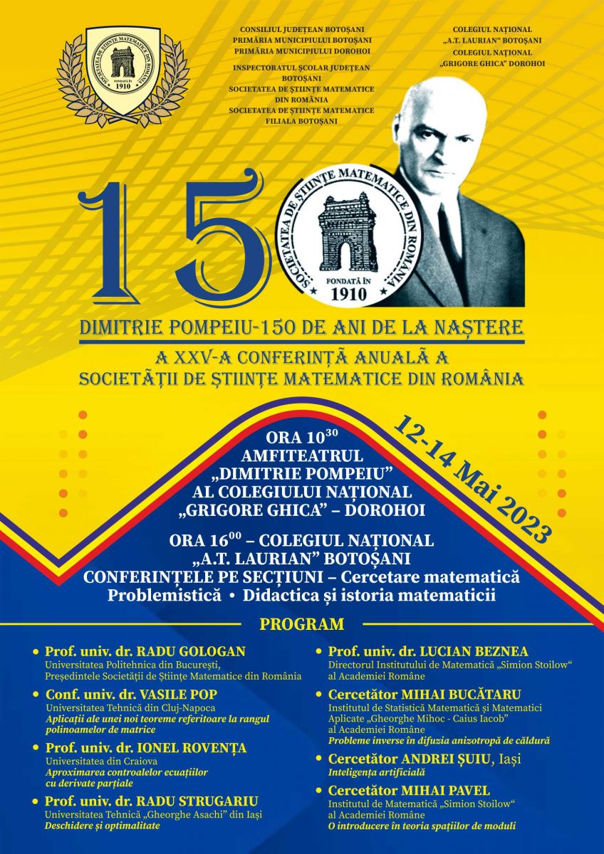 În perioada 12-14 mai 2023 se va desfășura la Botoșani cea de-a XXV-a ediție a Conferinţei Anuale a Societăţii de Ştiinţe Matematice din România, dedicată împlinirii a 150 de ani de la nașterea pe meleagurile botoșănene a matematicianului Dimitrie Pompeiu.