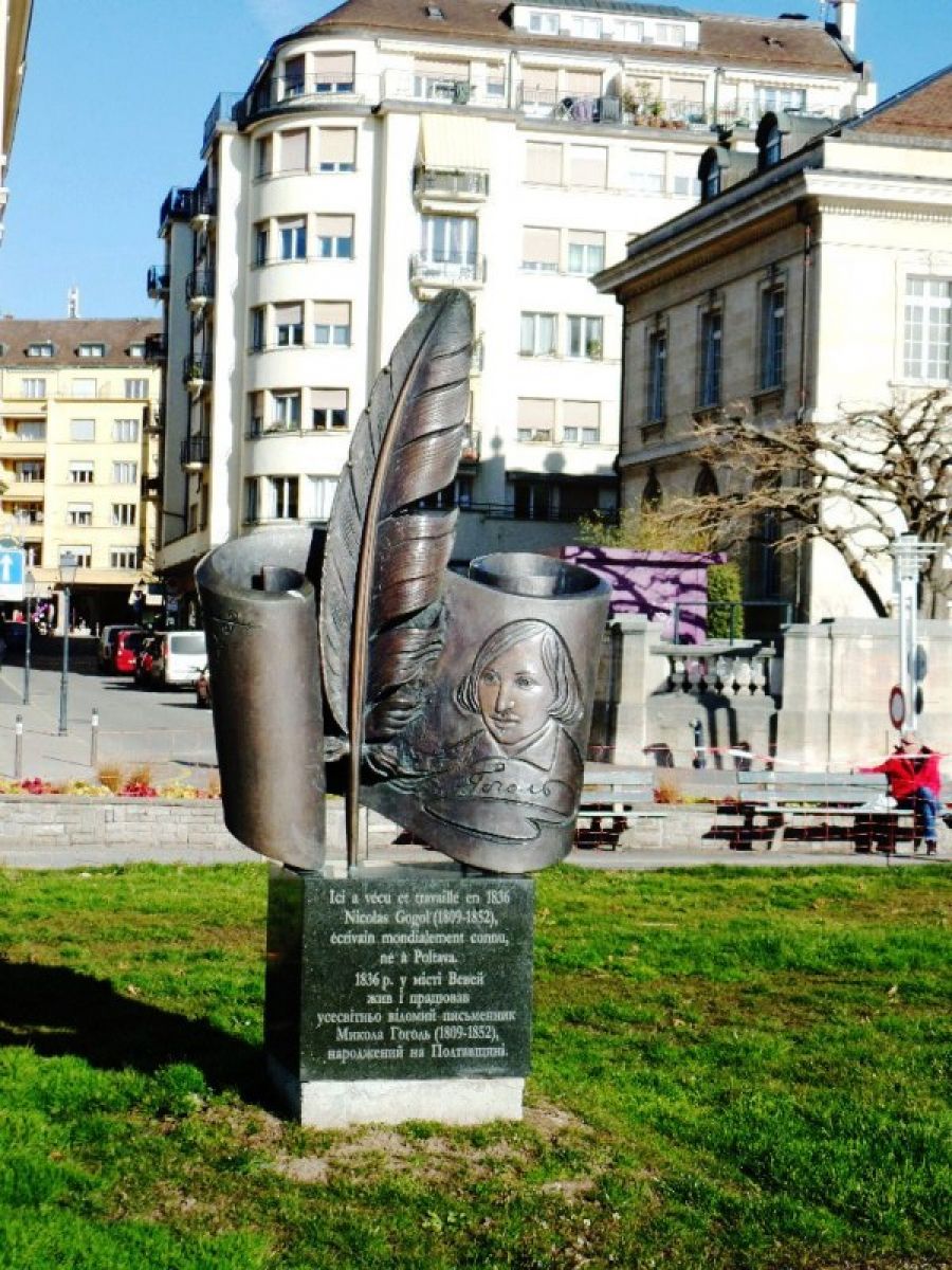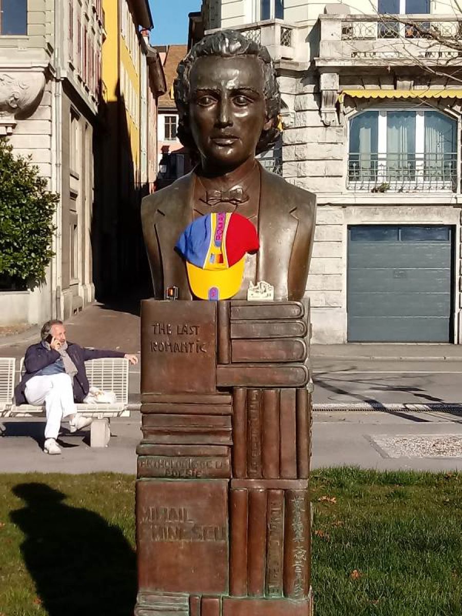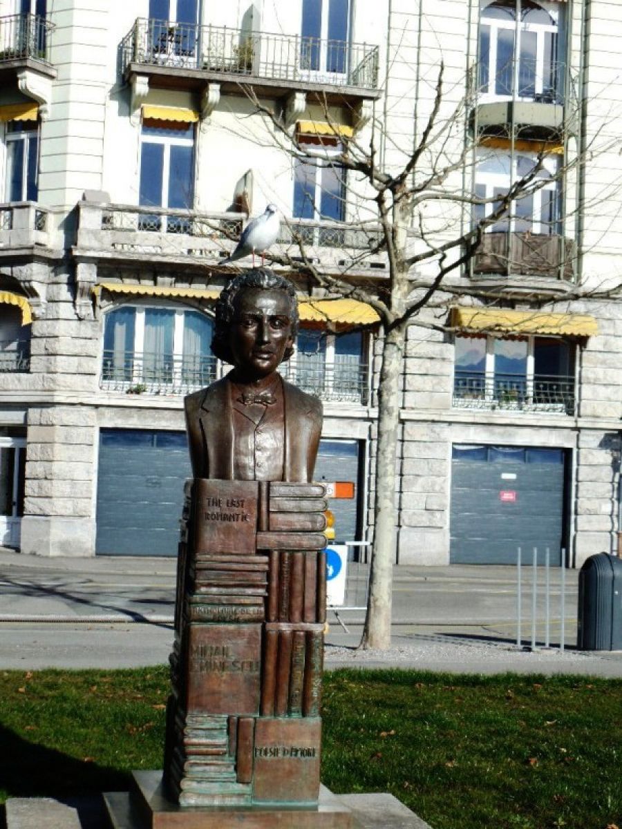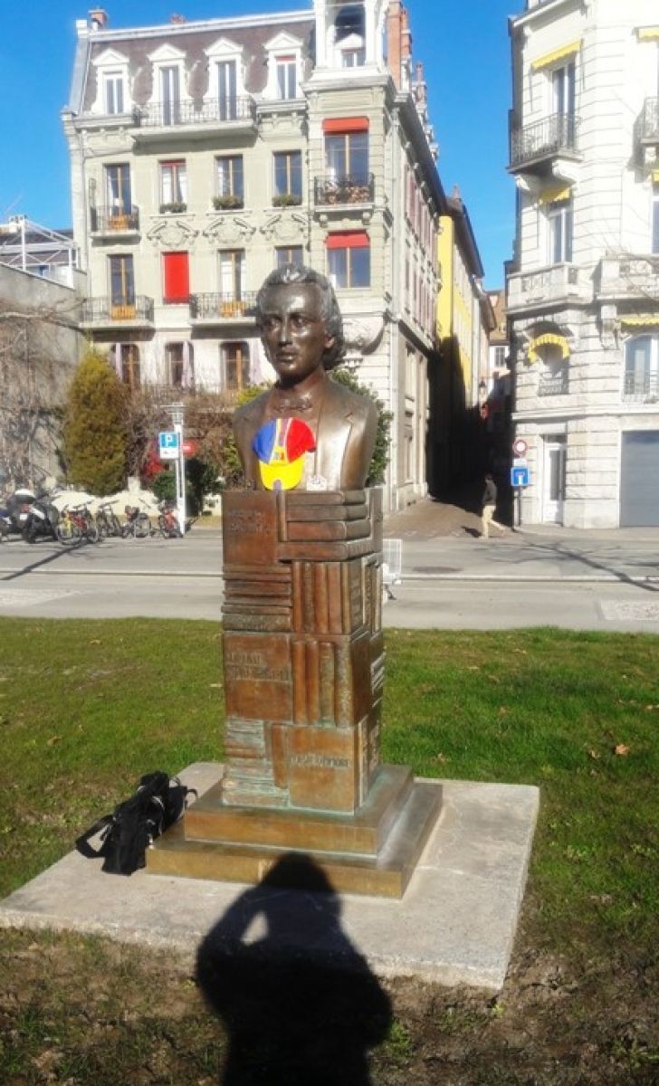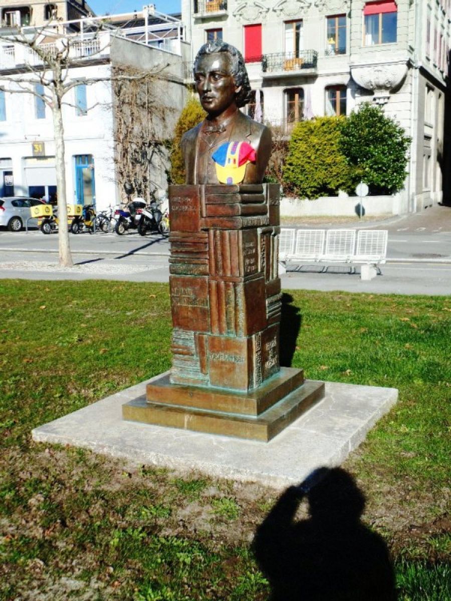 Pe o placă din faţa statuii se poate citi că a fost realizată cu ajutorul donaţiilor lui Nicolae Buzăianu, Adrian Sârbu, prinţul Dimitrie Sturdza, Radu Boroianu şi numeroşi români rezidenţi în Elveţia şi prieteni elveţieni ai României.