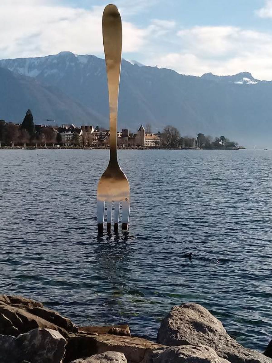 "La Grande Fourchette" (metal inoxidabil, 8 m), înfiptă în apele lacului, este simbolul Muzeului Alimentației, aflat foarte aproape.
