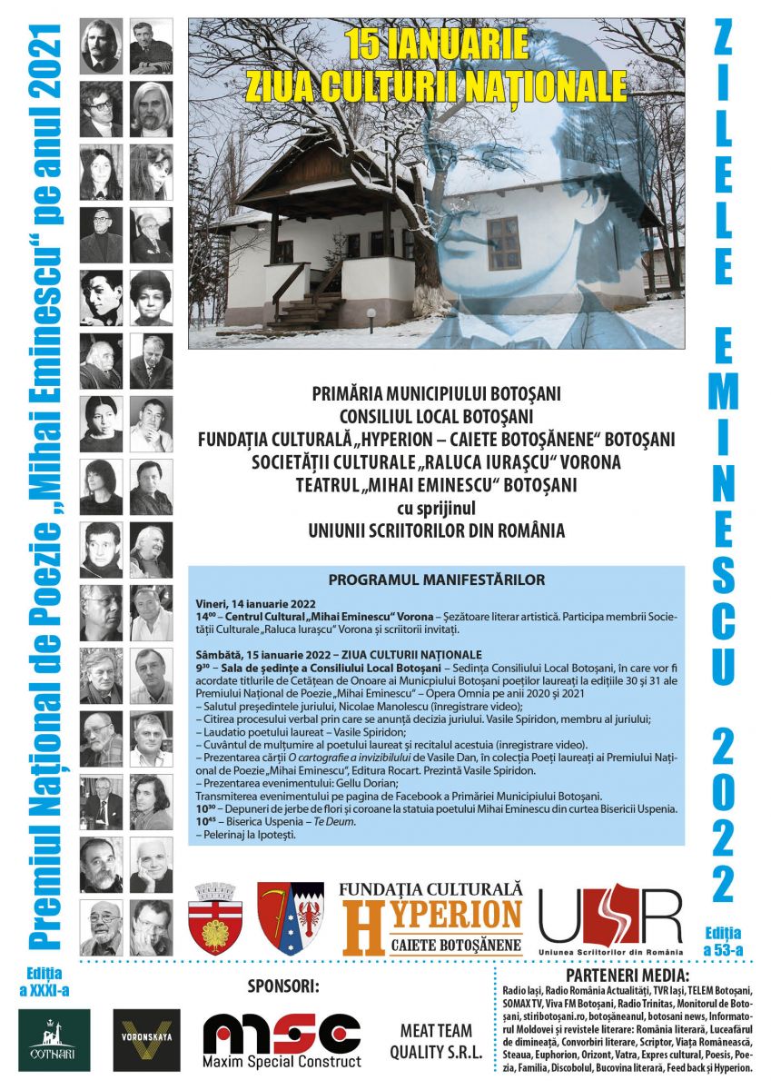 Pe 15 ianuarie, la Botoșani se derulează ediţia a 53-a a Zilelor Eminescu, precum și a XXXI-a ediție a Premiului Național de Poezie ”Mihai Eminescu”, pe anul 2021.