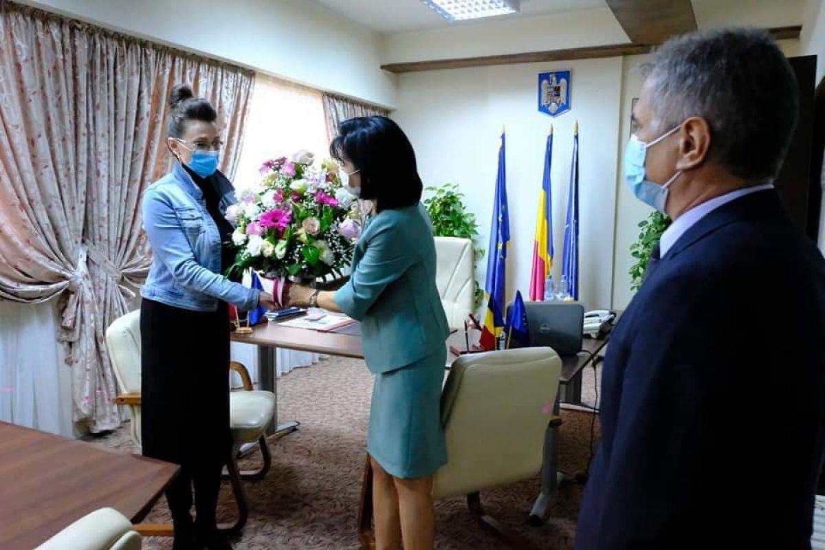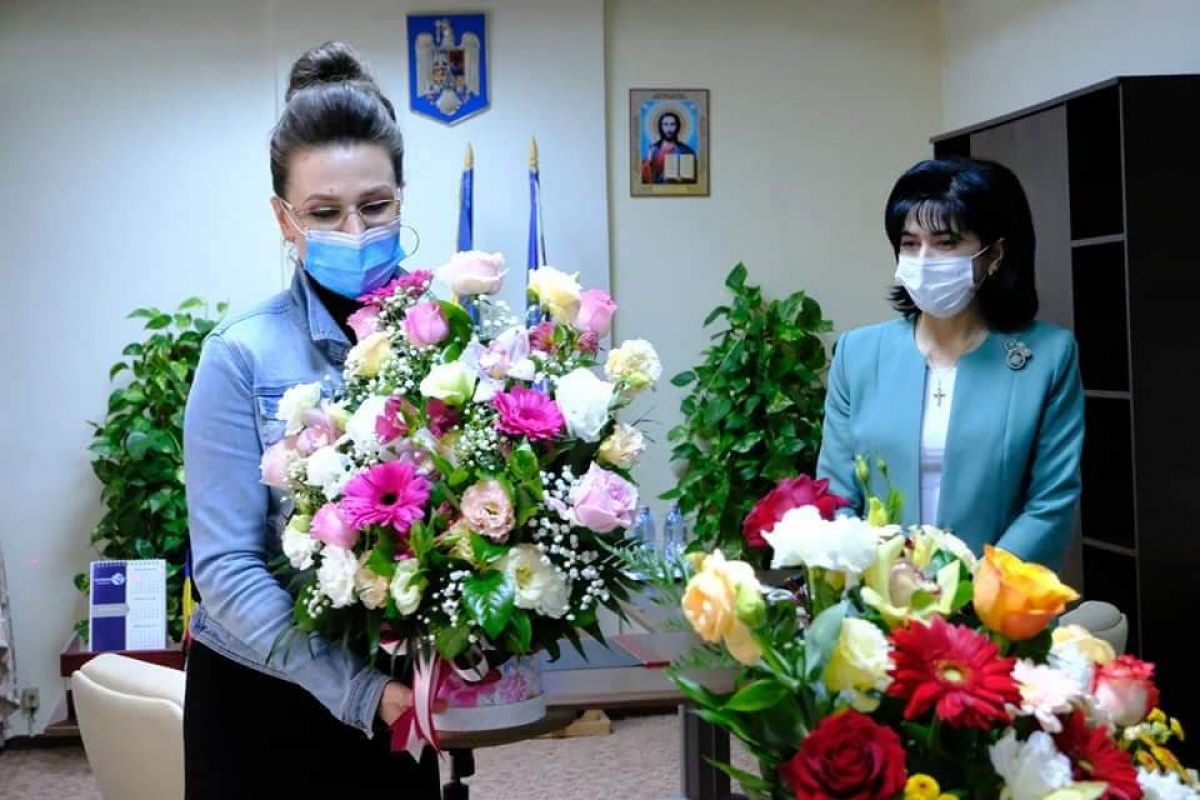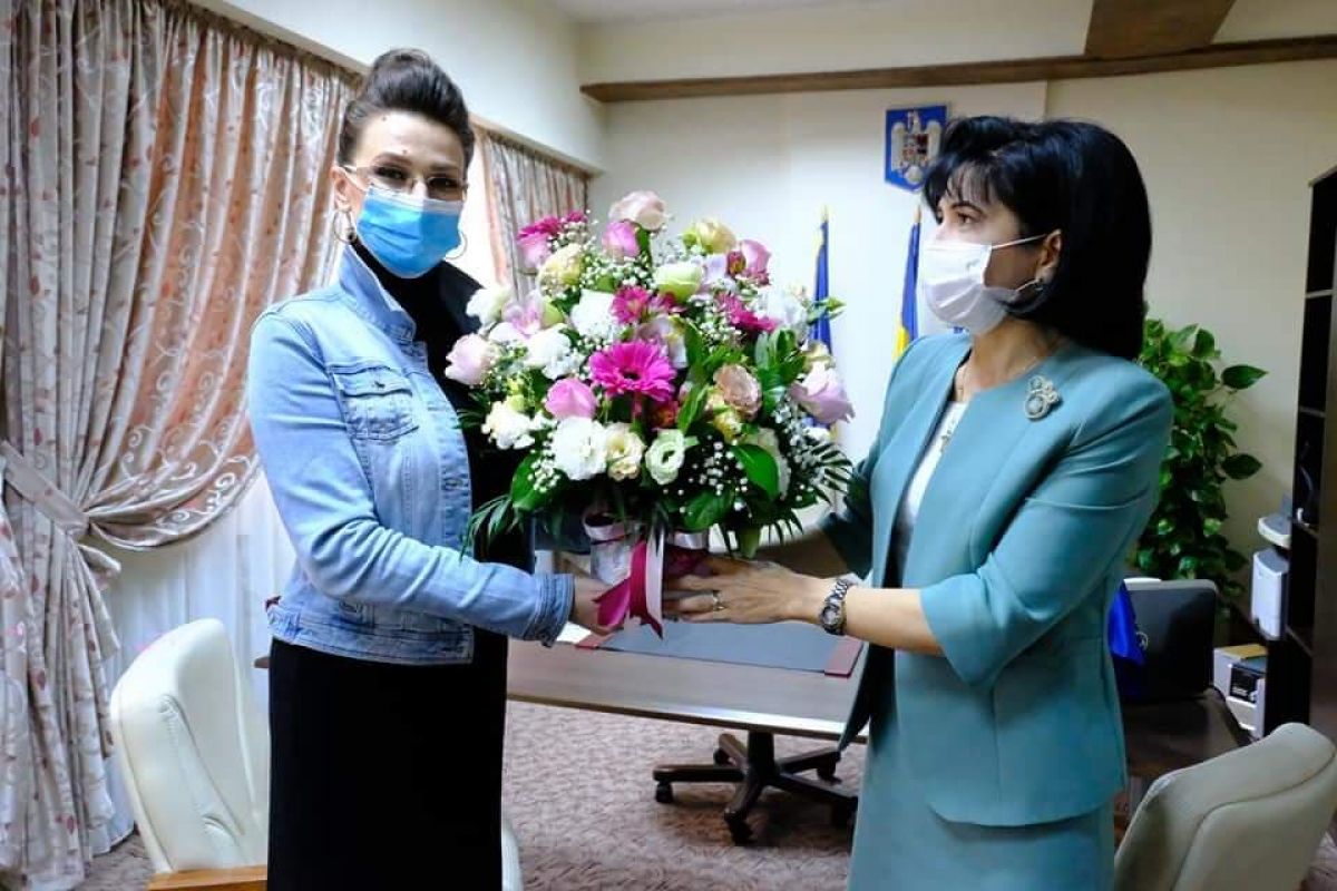 Un buchet de felicitări și mulțumiri din partea Doinei Federovici și a Consiliului Județean pentru Alina Huţu Călinescu, câștigătoarea Trofeului „Crizantema de Aur”, ediția a 53-a.