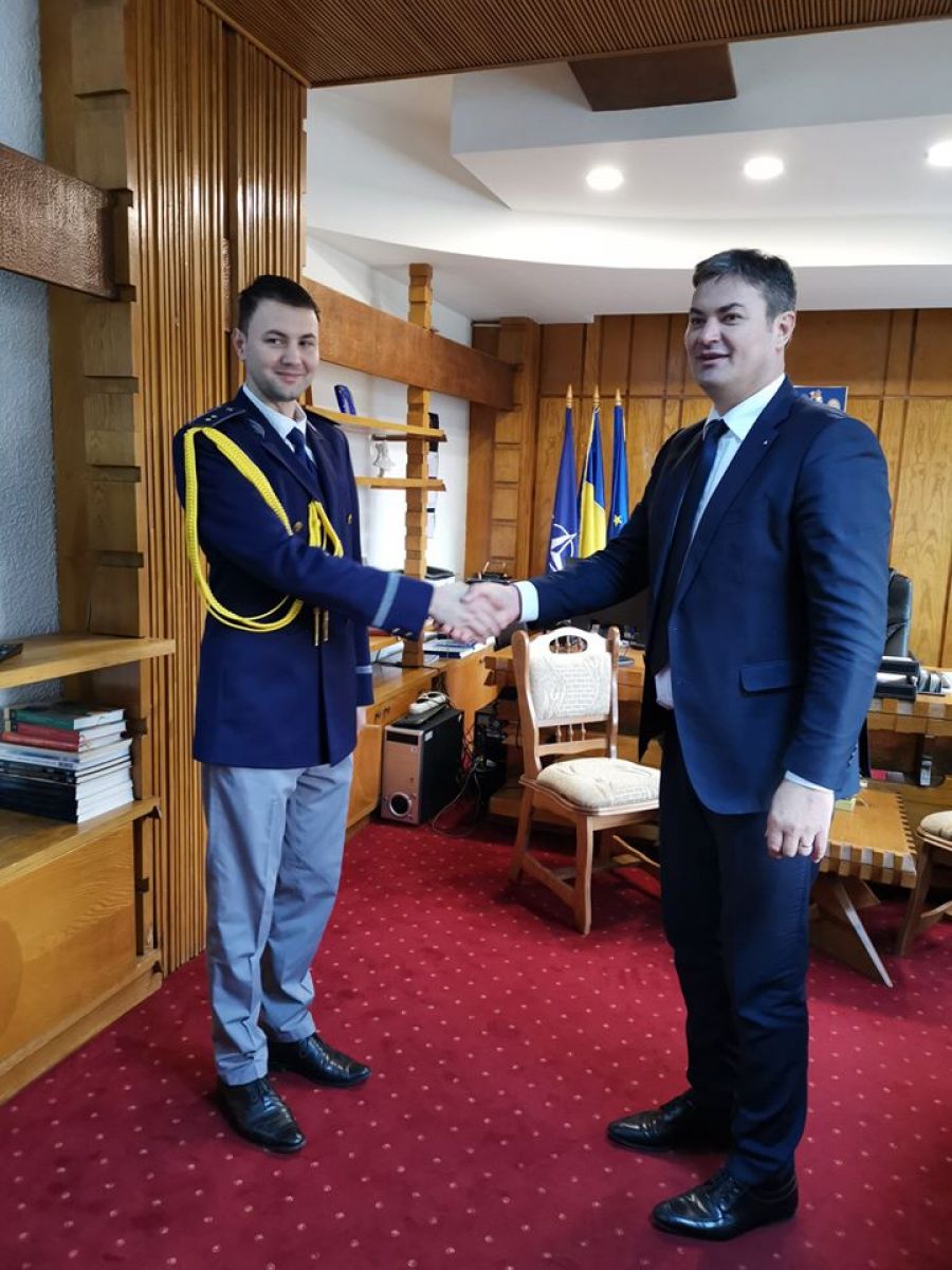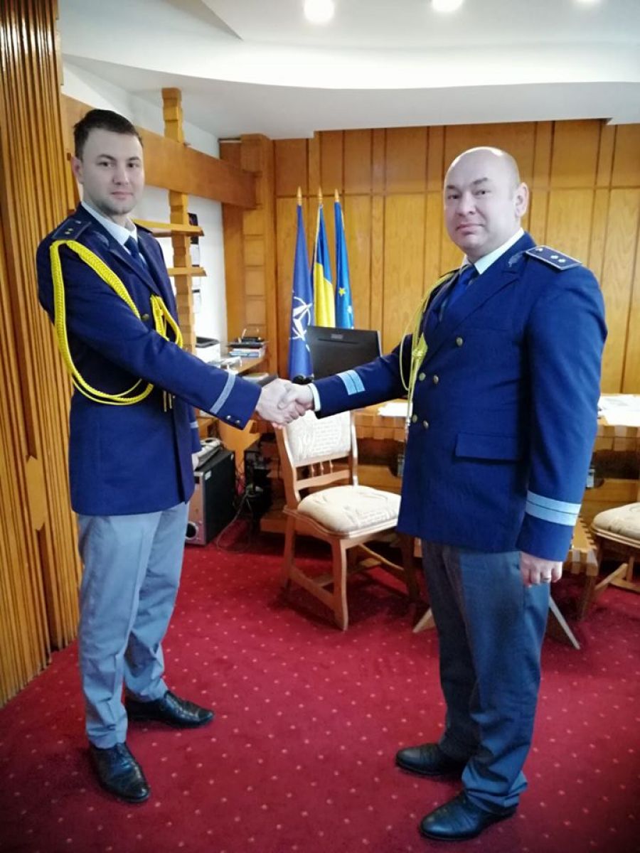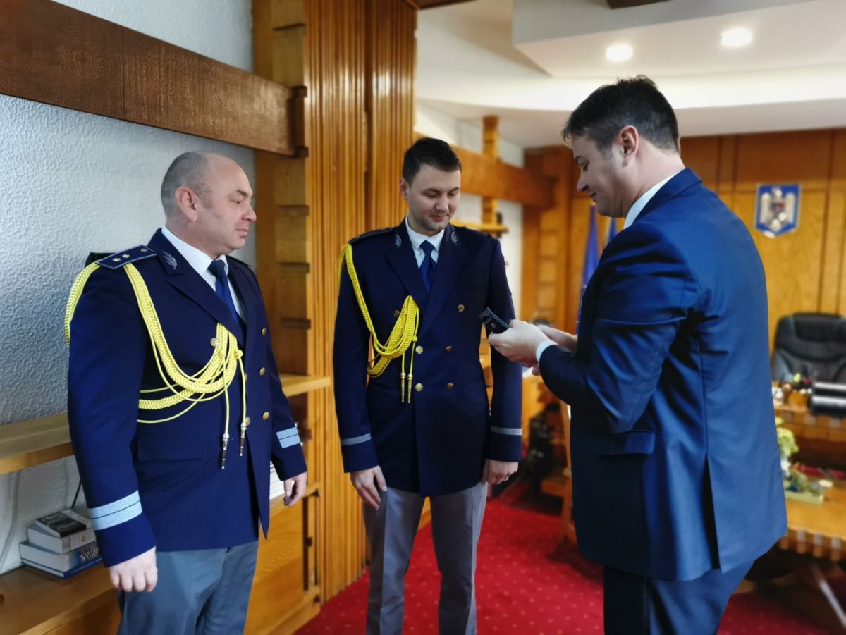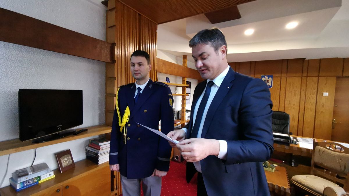 Prefectul Dan Șlincu a dat citire Dispoziției de avansare, felicitându-l ulterior pe Tudor-Gabriel Palote, care a fost astfel avansat de la gradul de subinspector de poliție în gradul profesional de inspector de poliție.