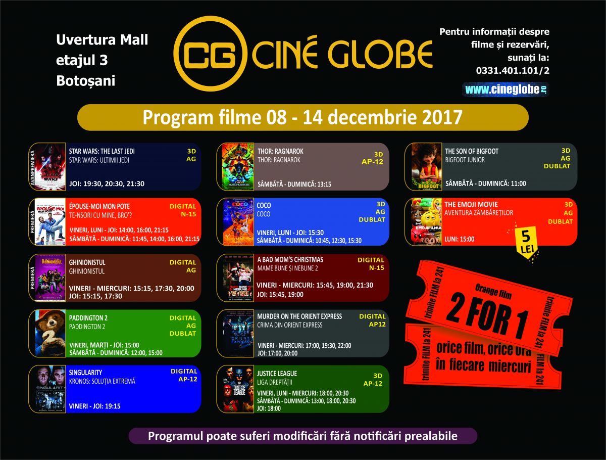 De asemenea cinefilii botoşăneni pot vedea premieră Epouse Moi Mon Pote (Te-nsori cu mine bro) şi Ghinionistul.