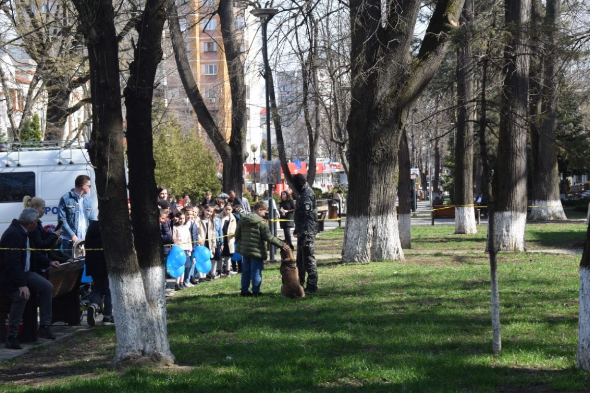 Copiii s-au bucurat de prestația polițistului canin oferită pe spațiul verde, sub coordonarea conductorului său.