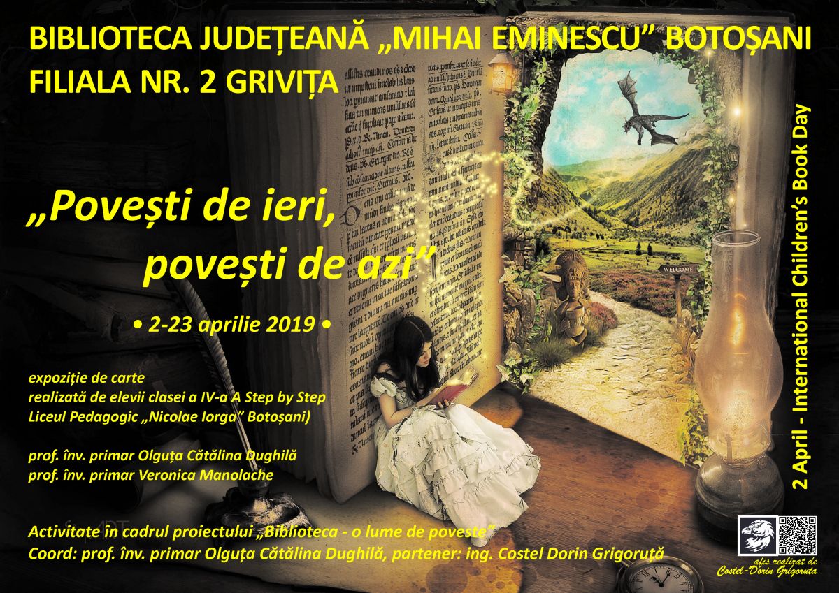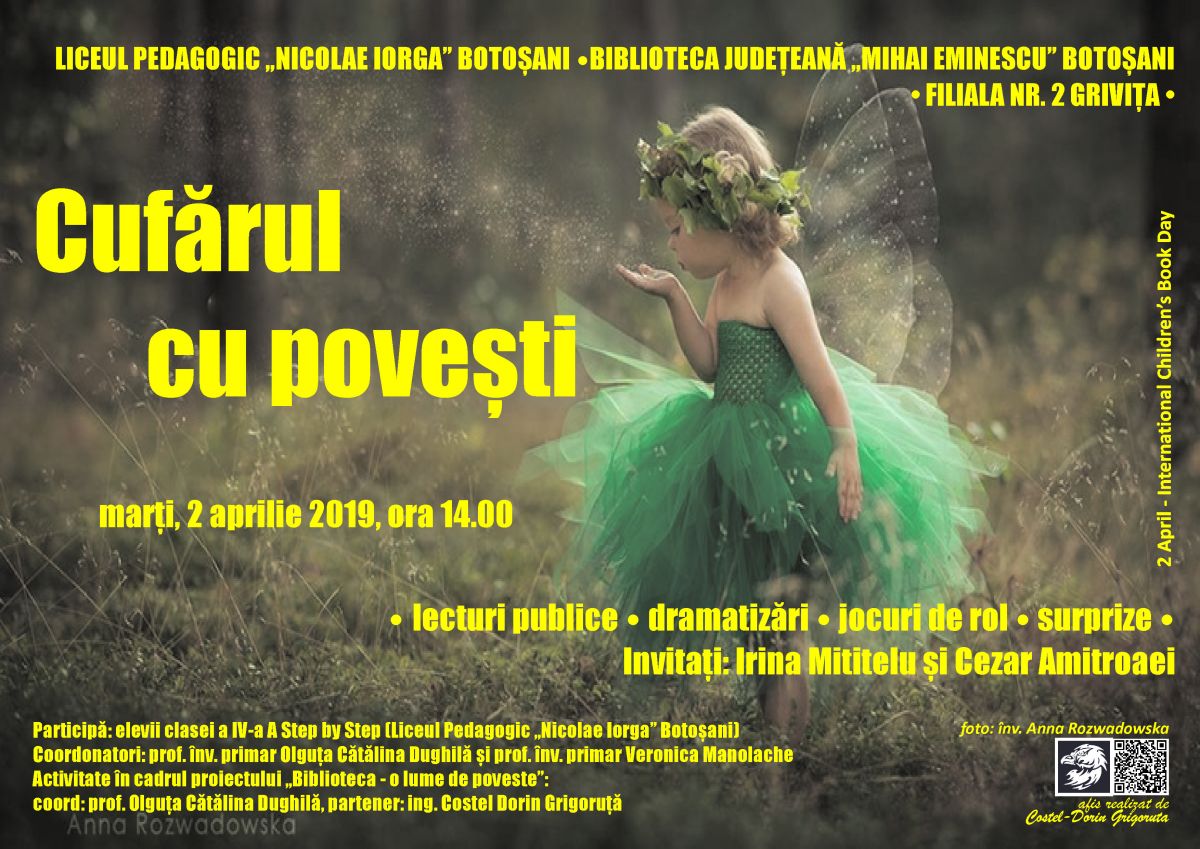 În fiecare an, la data de 2 aprilie celebrăm Ziua Internațională a Cărții pentru Copii, prilej cu care elevii clasei a IV-a A Step by Step de la Liceul Pedagogic „Nicolae Iorga” Botoșani (coord. prof. înv. primar Olguța Cătălina Dughilă și prof. înv. primar Veronica Manolache) vor desfășura o nouă activitate în cadrul proiectului educațional „Biblioteca – o lume de poveste”.