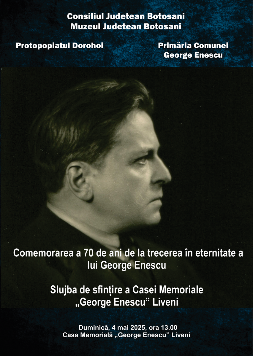Muzeul Județean Botoșani va organiza duminică, 4 mai 2025, un eveniment special pentru a marca împlinirea a 70 de ani de la trecerea în eternitate a marelui compozitor și muzician George Enescu.
