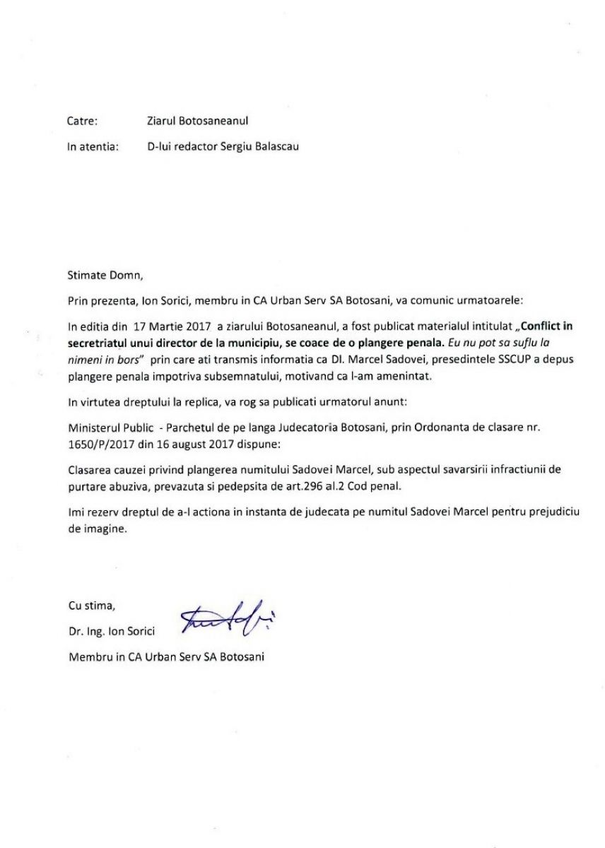 În luna august, la aproximativ cinci luni de la depunerea plângerii penale, Parchetul de pe lângă Judecătoria Botoşani a emis ordonanţă de clasare pentru infracţiunea de purtare abuzivă prevăzută de art. 296 Cod Penal.
