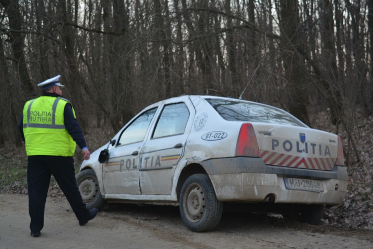 Agentul Valentin Filipov conducea o Dacia Logan pe traseul Hăneşti – Dângeni, pe un drum de pământ, iar pe porţiunea în care traversa o pădurice a pierdut controlul asupra volanului şi s-a răsturnat pe partea dreaptă a căii rutiere. Până ce să ajungă echipajul de la Serviciul Poliţiei Rutiere, automobilul a fost readus pe roţi, însă urmele impactului erau mai mult decât evidente. Parbrizul era crăpat, roata stânga faţă dislocată, oglinzile rupte, plafonul înfundat. Destul de irascibili, oamenii legii de la faţa locului au evitat dialogul, fiind chiar deranjaţi de prezenţa jurnaliştilor. Din câte se pare, şeful de post, care îl avea alături pe ajutorul său, ar fi avut ceva viteză. De asemenea, din pădure i-ar fi ieşit un porc mistreţ în faţă, care l-ar fi derutat. Din fericire, accidental nu s-a soldat cu rănirea celor doi. Dacă se va dovedi că agentul aflat la volan este singurul vinovat de cele întâmplate, va trebui să suporte singur costurile reparaţiei maşinii respective. (S.B.,G.E.)