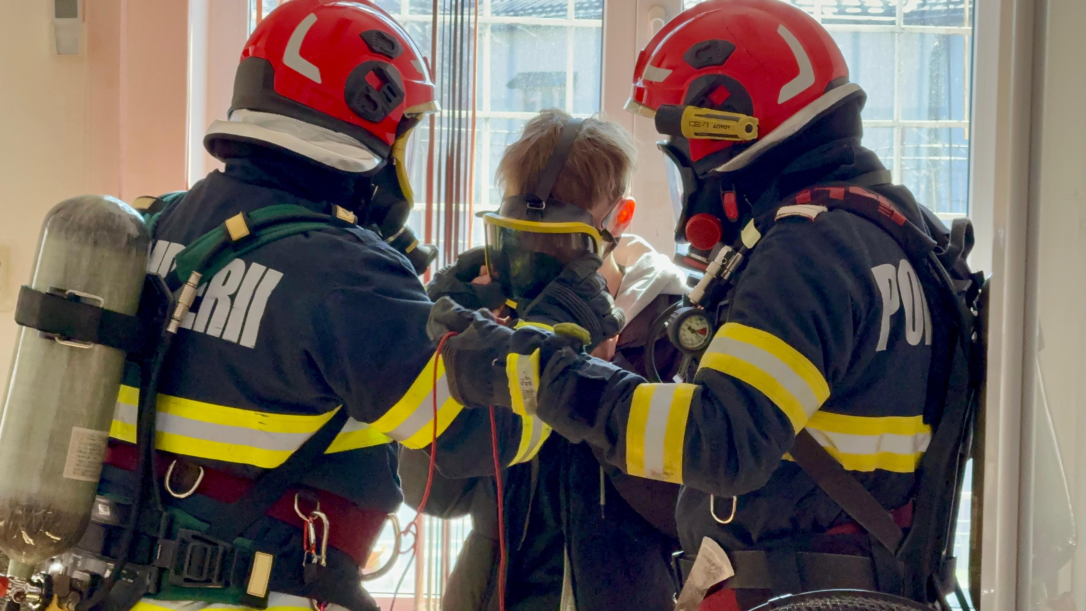 Pentru ca exercițiul să fie cât mai aproape de realitate, a fost simulată salvarea a șase elevi dintr-o sală de clasă.