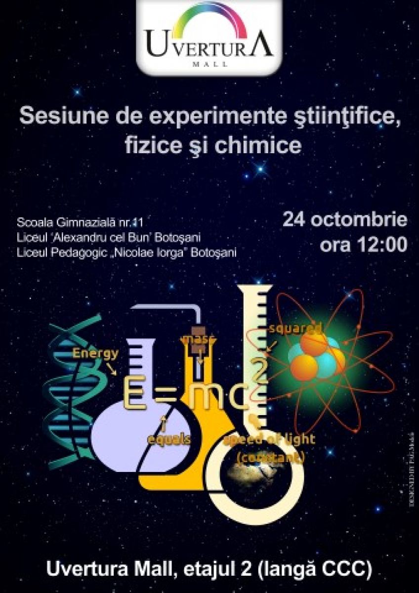 Uvertura Mall Botoșani invită elevii, sâmbătă, între orele 12:00-13:00, la o Sesiune de experimente științifice fizice și chimice, la etajul doi. Elevii și nu numai, vor putea interacționa cu cele mai interesante experimente fizice și chimice puse la dispoziție atât de profesori, cât și de elevii acestora. Eveniment în parteneriat cu Inspectoratul Școlar Județean Botoșani, Școala Gimnazială nr. 11, Liceul Pedagogic "Nicolae Iorga" și Liceul "Alexandru Cel Bun".