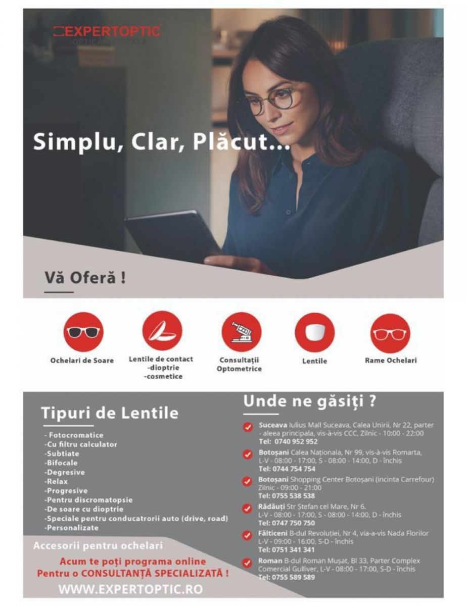 Dacă apar vreodată semne că ochii obosesc mult mai repede sau durerile de cap apar constant fără să identificați vreun motiv anume, atunci este necesar un consult. Puteți apela la ajutorul celor de la EXPERTOPTIC - cu pagina oficială www.expertoptic.ro. Rețeaua de magazine de optică medicală include două sedii la Botoșani - Calea Națională, nr. 99 și în incinta Shopping Center Botoșani - precum și alte sedii în Roman, Fălticeni, Suceava și Rădăuți. În oricare din locații, consultația este gratuită!