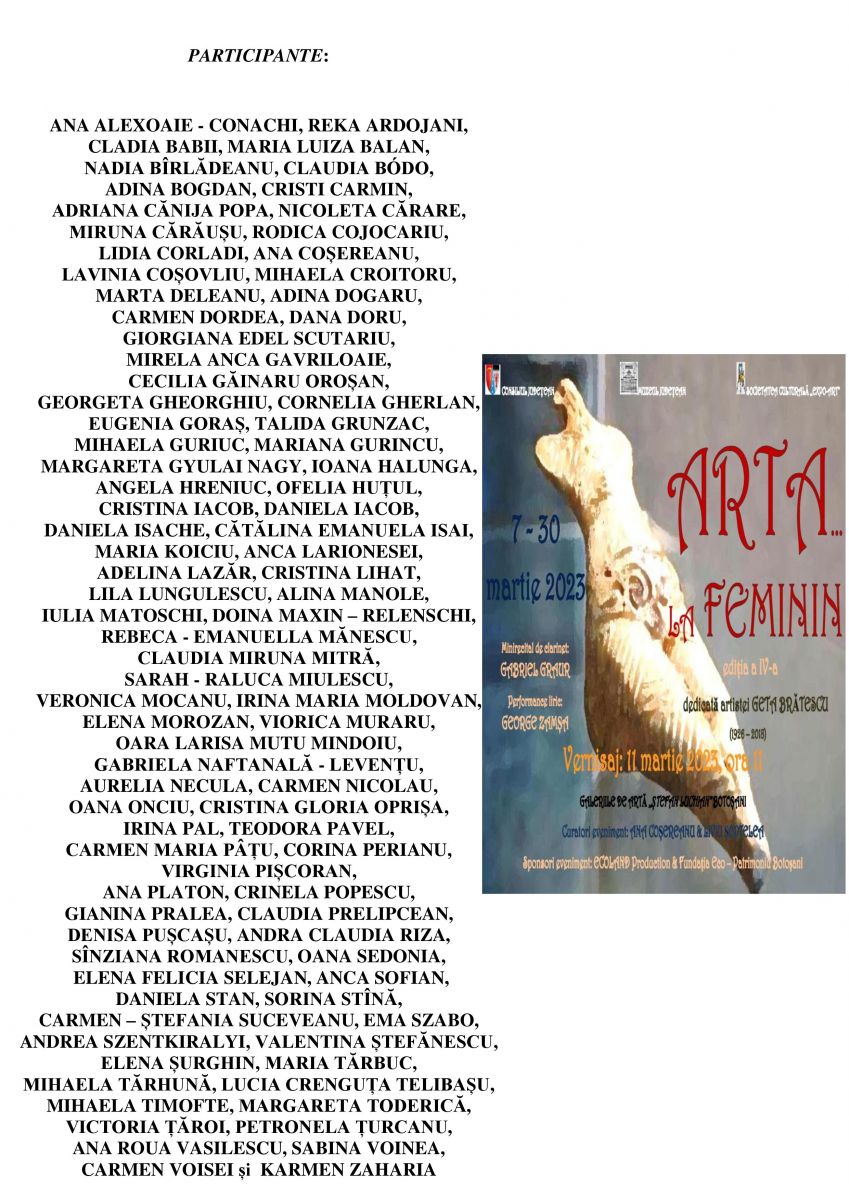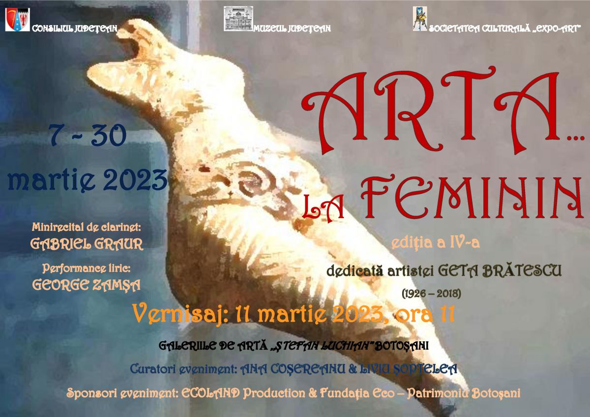 Muzeul Județean Botoșani - Secția de Artă Plastică și Etnografie găzduiește, în perioada 7 - 30 martie 2023, expoziția „Arta... la feminin”, ediția a IV-a.