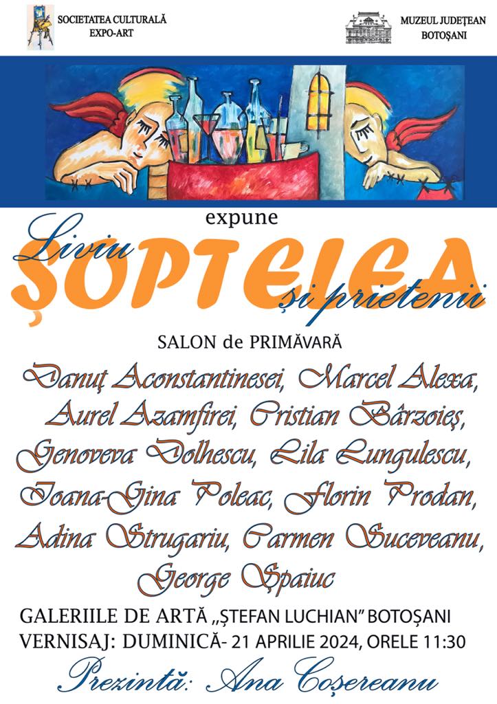 Muzeul Județean Botoșani găzduiește, în perioada 20 aprilie – 7 mai 2024, în spațiul Galeriilor de Artă „Ștefan Luchian” Botoșani, expoziția „Salon de primăvară – Liviu Șoptelea și prietenii”.