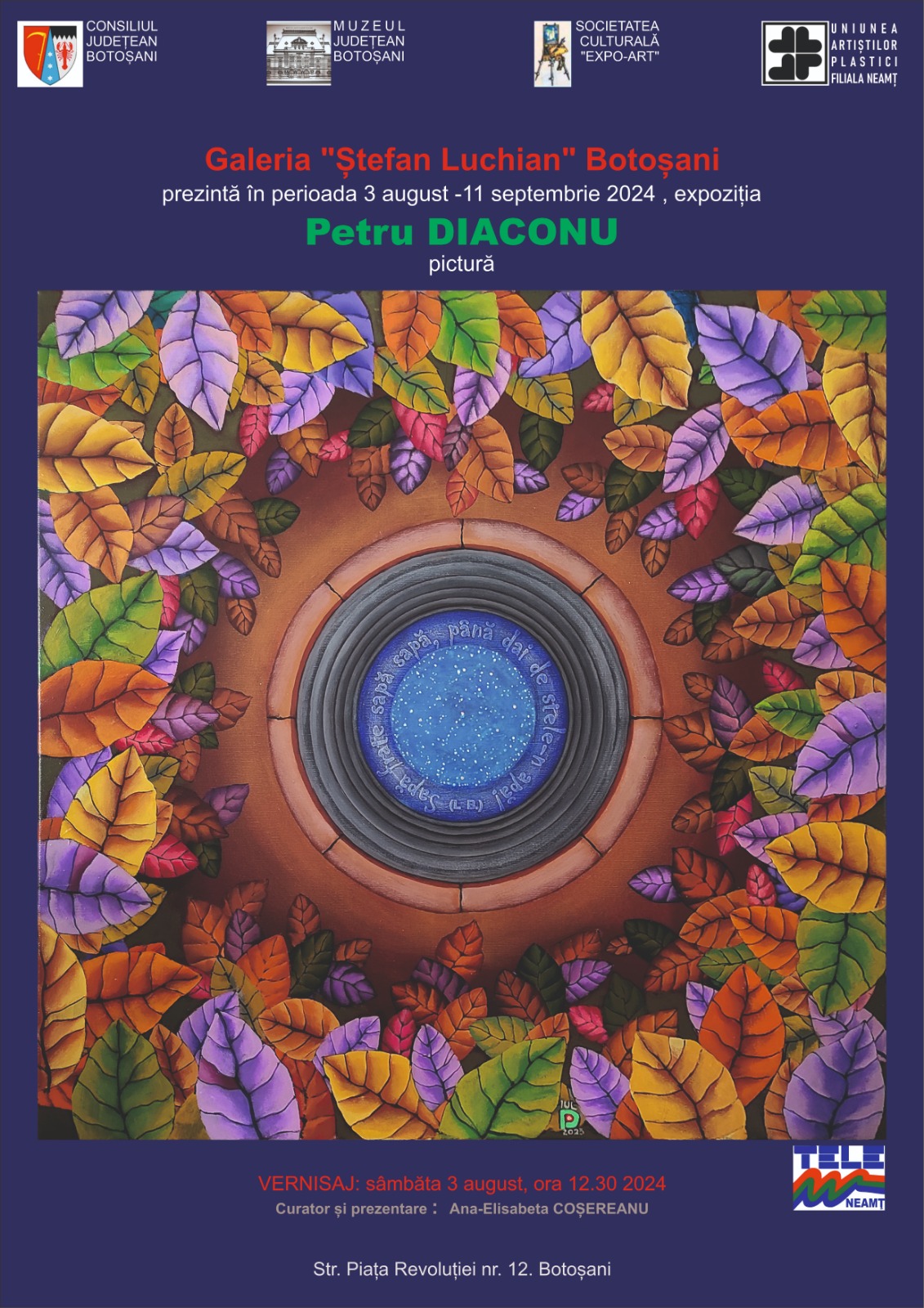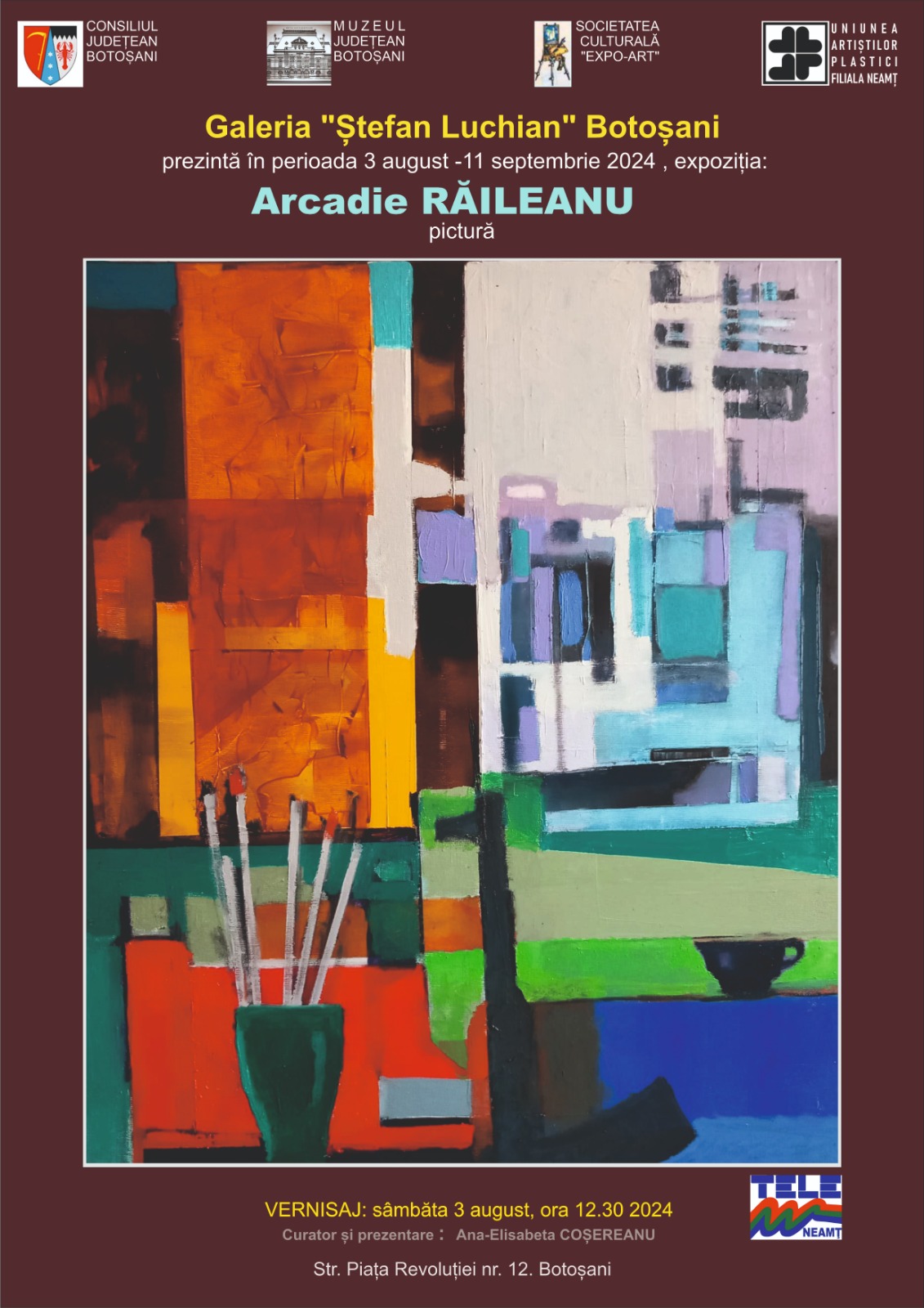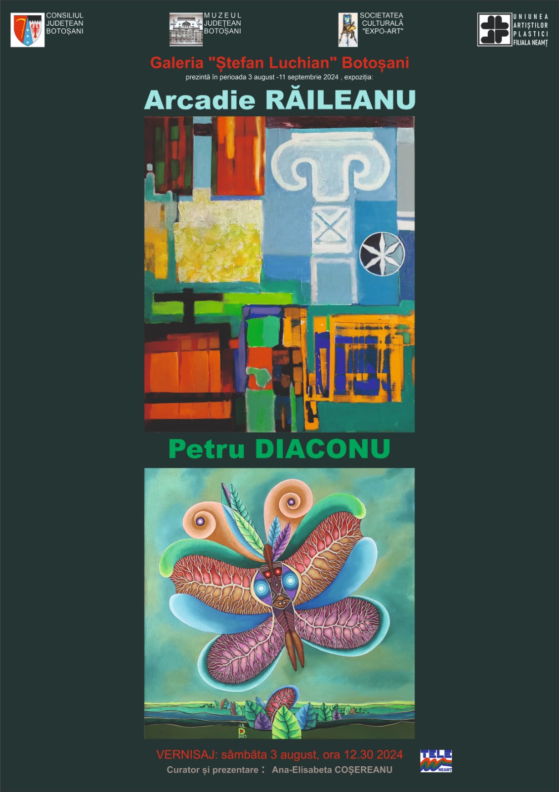 Muzeul Județean Botoșani vă invită, în perioada 3 august – 11 septembrie 2024, la Galeriile de Artă „Ștefan Luchian”, pentru o nouă întâlnire de suflet cu doi artiști nemțeni reuniți în cadrul expoziției Arcadie Răileanu/Petru Diaconu.