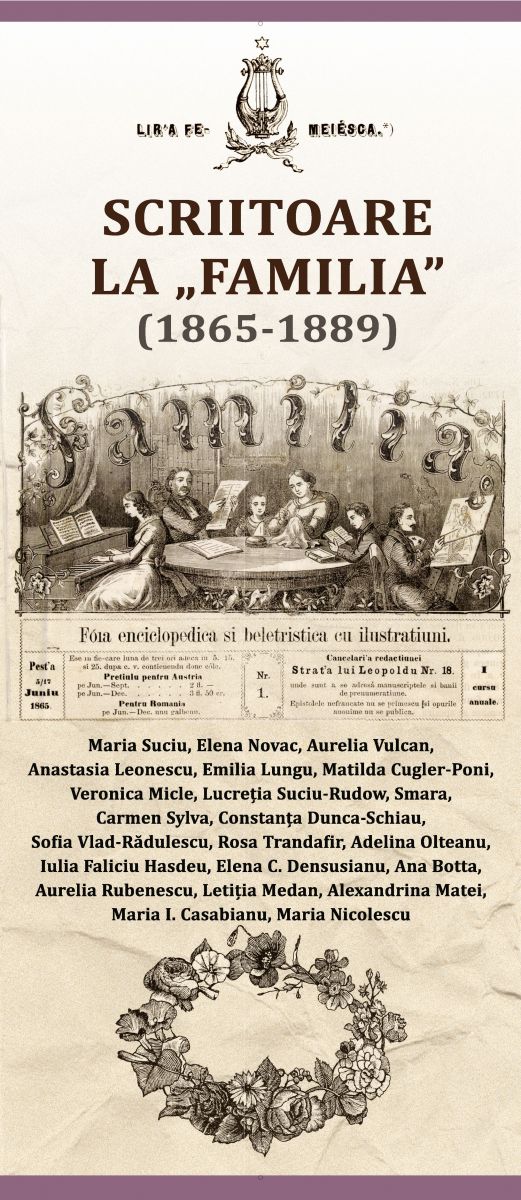 Expoziția Scriitoare la „Familia” (1865-1889) prezintă 23 de poete, prozatoare, eseiste, publiciste, folcloriste și traducătoare, contemporane cu Mihai Eminescu, care au publicat în revista „Familia” între 1865 (anul fondării „Familiei”) și 1889 (anul morții lui Eminescu), unele dintre acestea rămânând nume de referință în literatura română a secolului al XIX-lea, altele fiind militante active în mișcarea feministă, dar preferând pseudonime pentru activitatea lor literară, iar câteva nedivulgându-și niciodată numele complet: Maria Suciu, Elena Novac, Aurelia Vulcan, Anastasia Leonescu, Emilia Lungu, Matilda Cugler-Poni, Veronica Micle, Lucreția Suciu-Rudow, Smara, Carmen Sylva, Constanța Dunca-Schiau, Sofia Vlad-Rădulescu, Rosa Trandafir, Adelina Olteanu, Maria Petrescu, Iulia Faliciu Hasdeu, Elena C. Densusianu, Ana Botta, Aurelia Rubenescu, Letiția Medan, Alexandrina Matei, Maria I. Casabianu, Maria Nicolescu.
