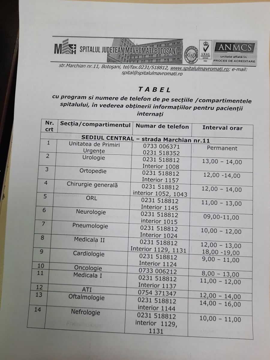 Reprezentanții Spitalului Județean Mavromati au pus la dispoziție numere de telefon pentru fiecare secție în parte în vederea obținerii informațiilor pentru pacienții internați. Ori de multe ori rudele pacienților sună în disperare însă nimeni nu răspunde la telefon.