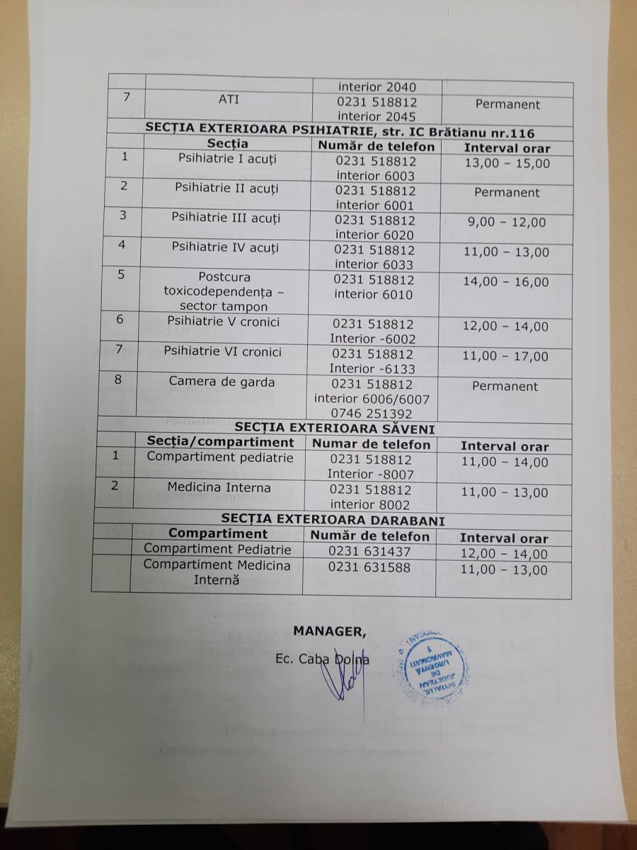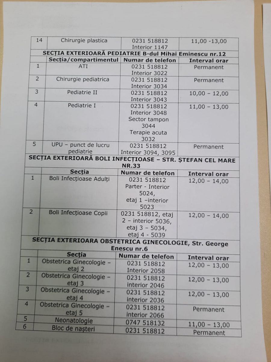 Reprezentanții celei mare unități medicale au făcut un program adaptat pentru fiecare secție. Există un anumit interval orar unde rudele pot afla detalii despre pacienții internați.