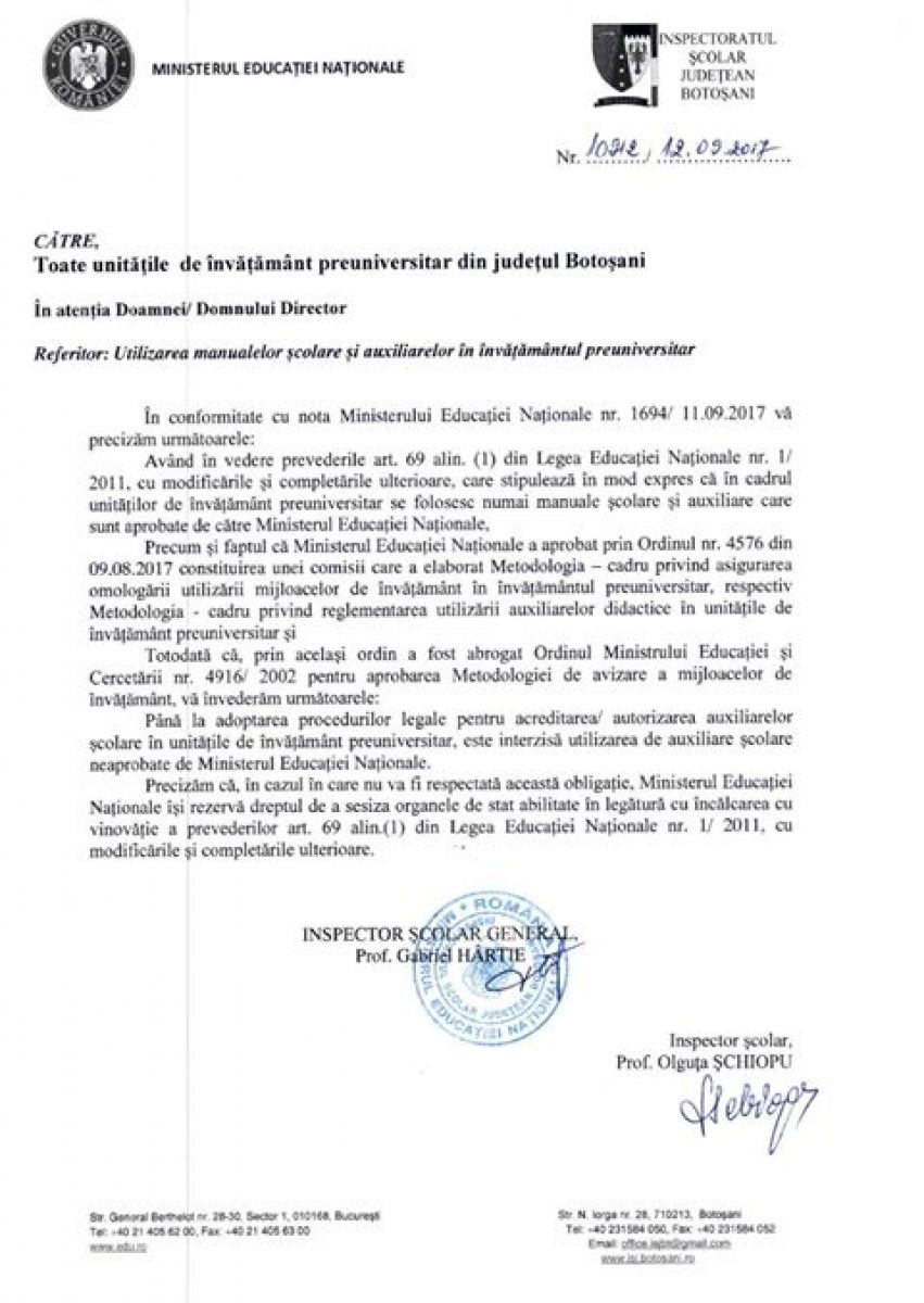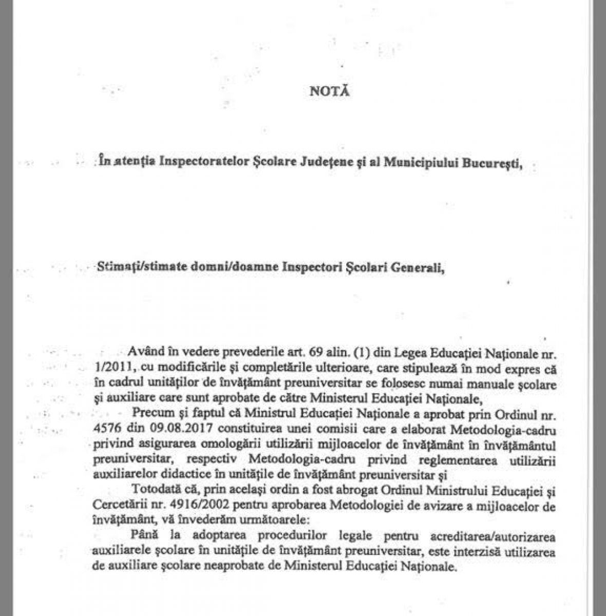 „Până la adoptarea procedurilor legale pentru acreditarea/autorizarea auxiliarelor școlare în unitățile de învățământ preuniversitar, este interzisă utilizarea de auxiliare școlare neaprobate de Ministerul Educației Naționale. Precizăm că în cazul în care nu va fi respectată această obligație, Ministerul Educației Naționale își rezervă dreptul de a sesiză organele de stat abilitate în legătură cu încălcarea cu vinovăție a prevederilor articolului 69 alineatul 1 din Legea Educației Naționale numărul 1/2011 cu modificările și completările ulterioare”, se mai arată în notă transmisă de MEN.